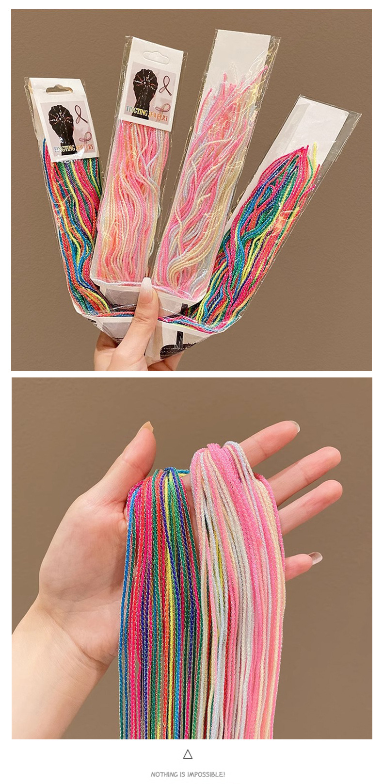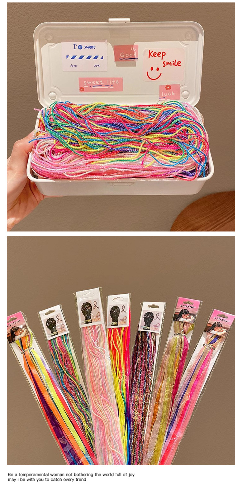 | Colores | 1 #16 cuerdas de gradiente finas,2 #24 cuerdas de gradiente finas,3 #32 cuerdas de gradiente finas,4 #20 cuerdas gradientes gruesas,5 #30 cuerdas gradientes gruesas,6 # cinta de color 20 raíces,7 #30 cintas de colores,8 #20 fantasía metálica,9 #30 fantasmas metálicos,10 #18 colores mezclados planos finos,11 #30 colores mezclados planos finos,12 #20 tiras de arena de colores,13 #30 tiras de arena de colores,14 #18 colores gruesos,15 # cinturón de arena de color,16 # Colorido 16 raíces,17 #16 rosa,3 # rosa colorido-alrededor de 100 piezas,4 # Colorful Sky Blue-alrededor de 100 raíces,7 # color mixto-alrededor de 100 raíces,9 # plata colorida-alrededor de 100 piezas |