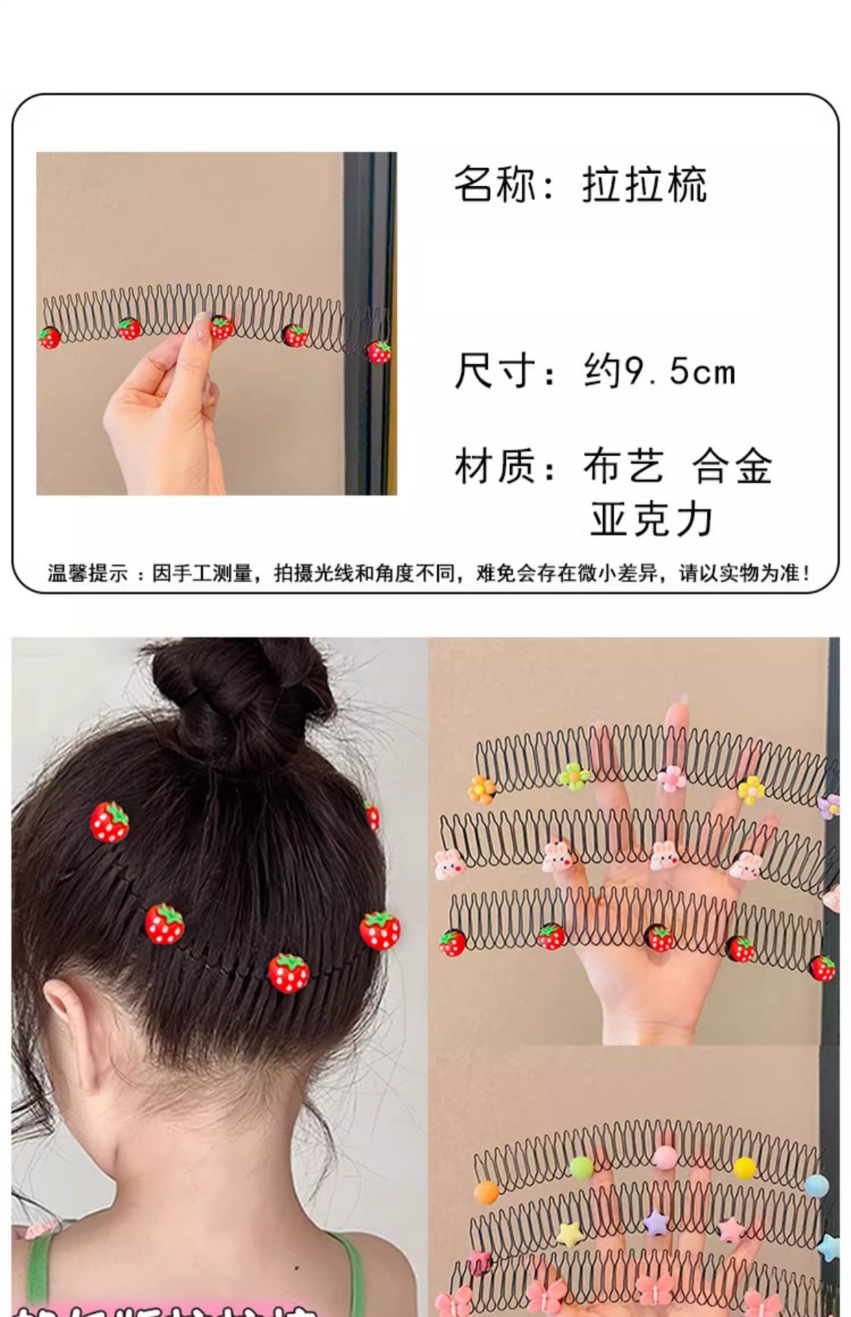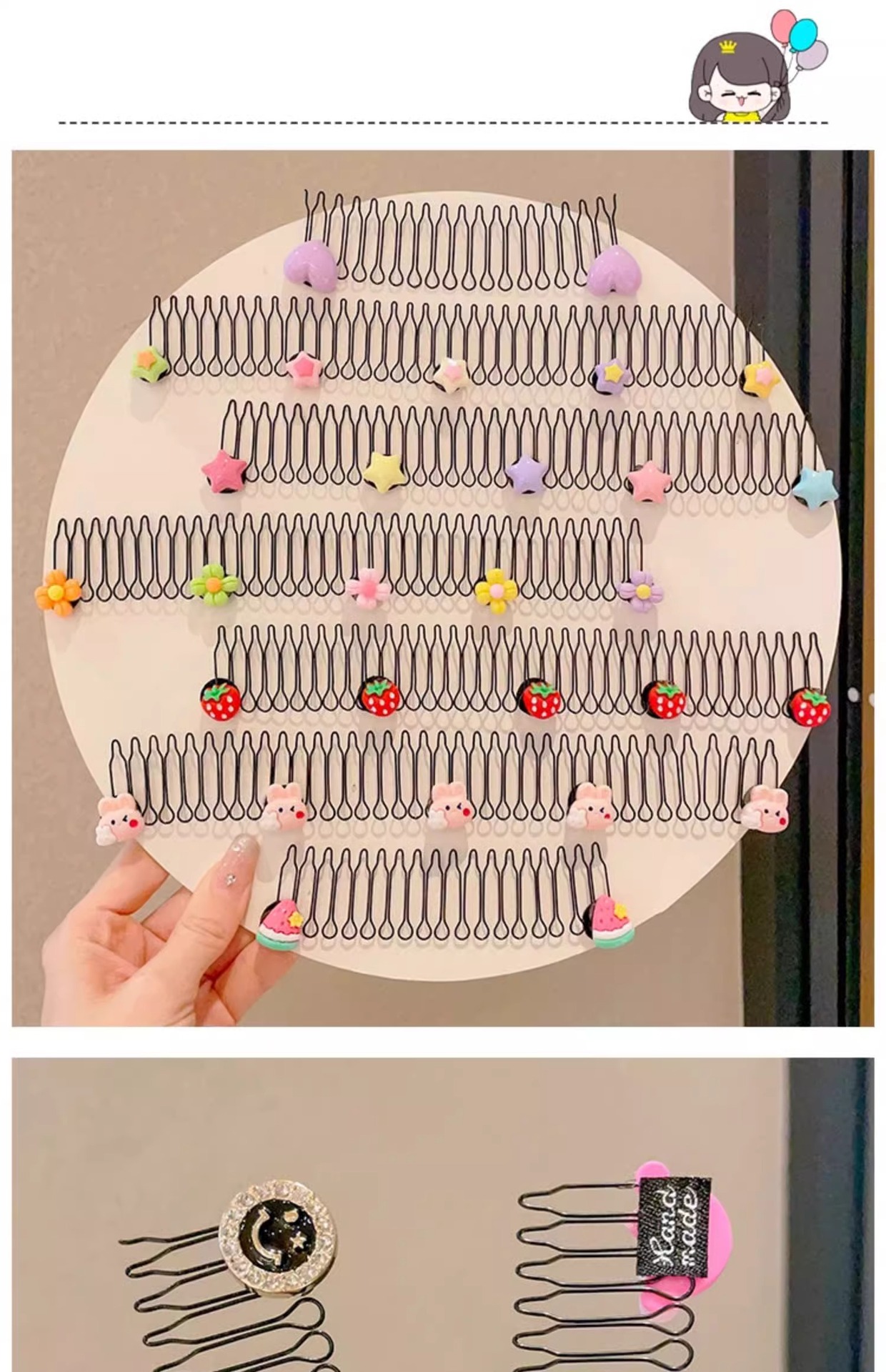 | Color | 1 peinado de fresa, 2 peinado de frijoles de azúcar de colores, 3 peinado de frutas, 4 peinado de flores, 5 peinado de estrellas de doble capa, 6 peinado de conejo, 8 peinado de estrellas |