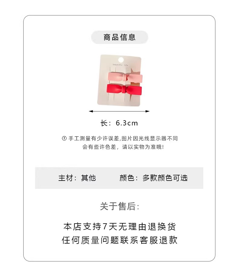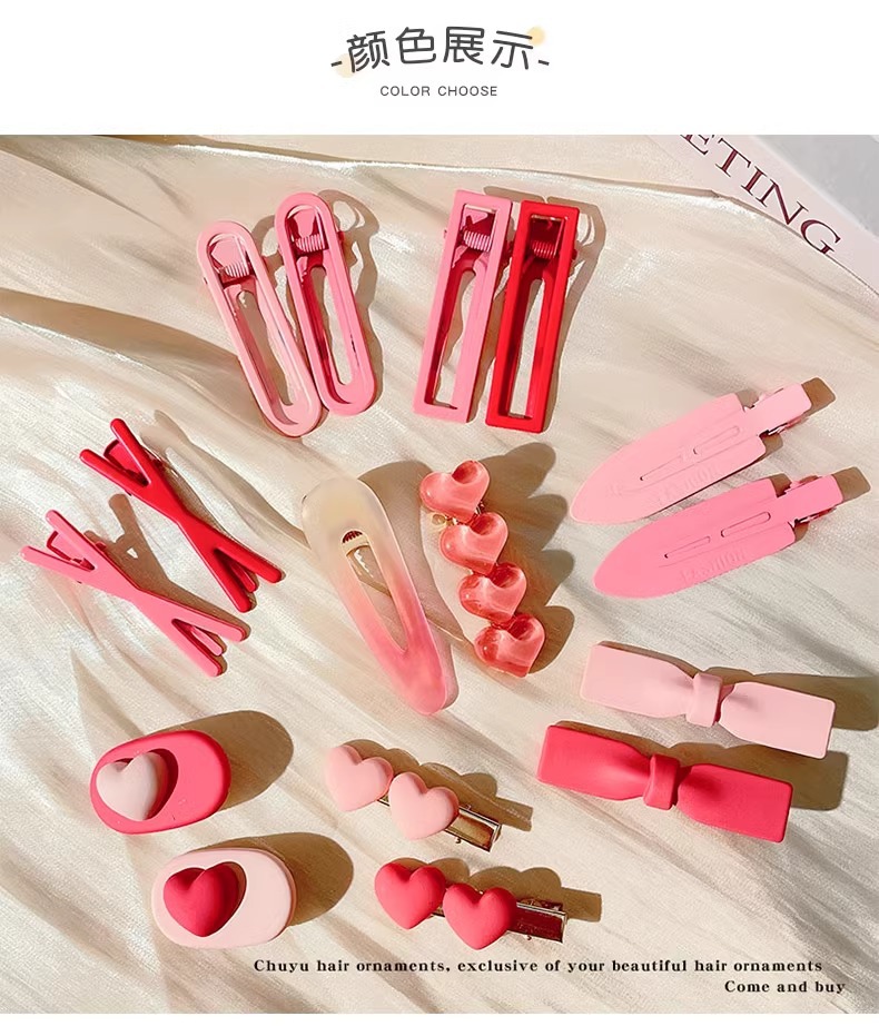 | Color | 11#水蜜桃两件套,13#粉色系-三件,14#粉色渐变三件套发夹,2#玫红一字夹,3#玫红爱心款,4#粉色爱心款,5#玫红小花,6#粉色小花,7#两颗爱心,5#单个蝴蝶结(大),6#单个蝴蝶结(小),8#单个樱桃,10#单个碎碎爱心,27#粉色桃心小抓夹,9#方形款粉色3件,10#粉色兔子款3件套,5#粉色(单个),4#玫红雪糕发夹,2#粉色2个装,3#玫红2个装,6#粉色系兔兔3件套,3#粉色星星夹组合10件套,5#五角星3件,2#水滴3件,3#流星3件,4#爱心3件,1#紫色,3#蓝色,2#深蓝波点星星夹组合10件套,1#绿色渐变三件套发夹,2#绿色系-三件,2#橘色渐变三件套发夹,3#橘色系-三件,3#蓝色渐变三件套发夹,7#蓝色系-三件,4#黄色渐变三件套发夹,1#黄色系-三件,5#紫色渐变三件套发夹,4#紫色系-三件,6#咖色渐变三件套发夹,5#咖色系-三件,1#奶白色星星夹组合10件套,4#橙色波点星星夹10件套,5#彩色水光星星夹组合10件套,1#韩粉爱心,2#浅粉爱心,3#果绿爱心,4#浅蓝爱心,5#黄色爱心,9#蓝色星星,4#玫红-花朵,6#少女粉,1#天蓝色,3#清柠色,2#淡粉色,12#调皮粉,10#笑脸粉,4#玫红色,5#奶茶色,7#黑色,8#香芋紫,9#小鸭黄,11#湖蓝色,2#蓝色雪糕发夹,3#绿色雪糕发夹,1#粉色,2#蓝色,3#绿色,4#玫红,5#黄色,2#橘黄鸭鸭3件套,3#果冻紫黄爱心3件套,爱心2件,气质4件,店长推荐4件,蝴蝶结2件,小清新4件,可爱4件,颜值4件,清新4件,热卖4件,人气4件套,水蜜桃2件,桃心小抓夹2件,甜美4件,推荐4件,椭圆爱心2件,无痕夹2件,小花2件,蜜桃2件,优雅4件,粉色7件套,大号粉色+大号玫红,玫红+粉色2个装,粉色蝴蝶2个装,花朵蝴蝶结2件套,山茶花5件,玫粉色双星1对,9#单个玫瑰花花,8#交叉粉色3件,1#矩形3件,3#粉色草莓,玫瑰花2件,粉色大小号4件,馥郁2件 |