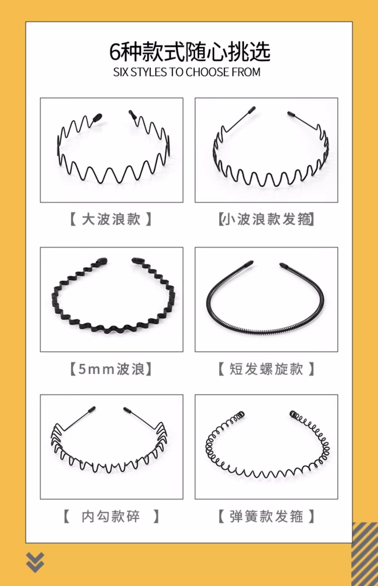 | Color | Dual ondas simples, estilo espiral de cabello corto, aro de cabello de resorte, aro de cabello de gancho interno, aro de cabello de onda grande en la parte posterior, aro de cabello de onda pequeña, aro de cabello de onda de 5 mm |
