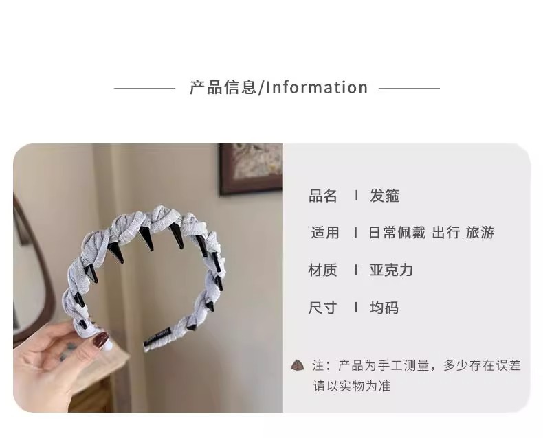 | Colores | 1 # diadema torta beige,2 # Diadema torta gris azul,3 # Diadema torta color café,4 # Diadema de giro negro |