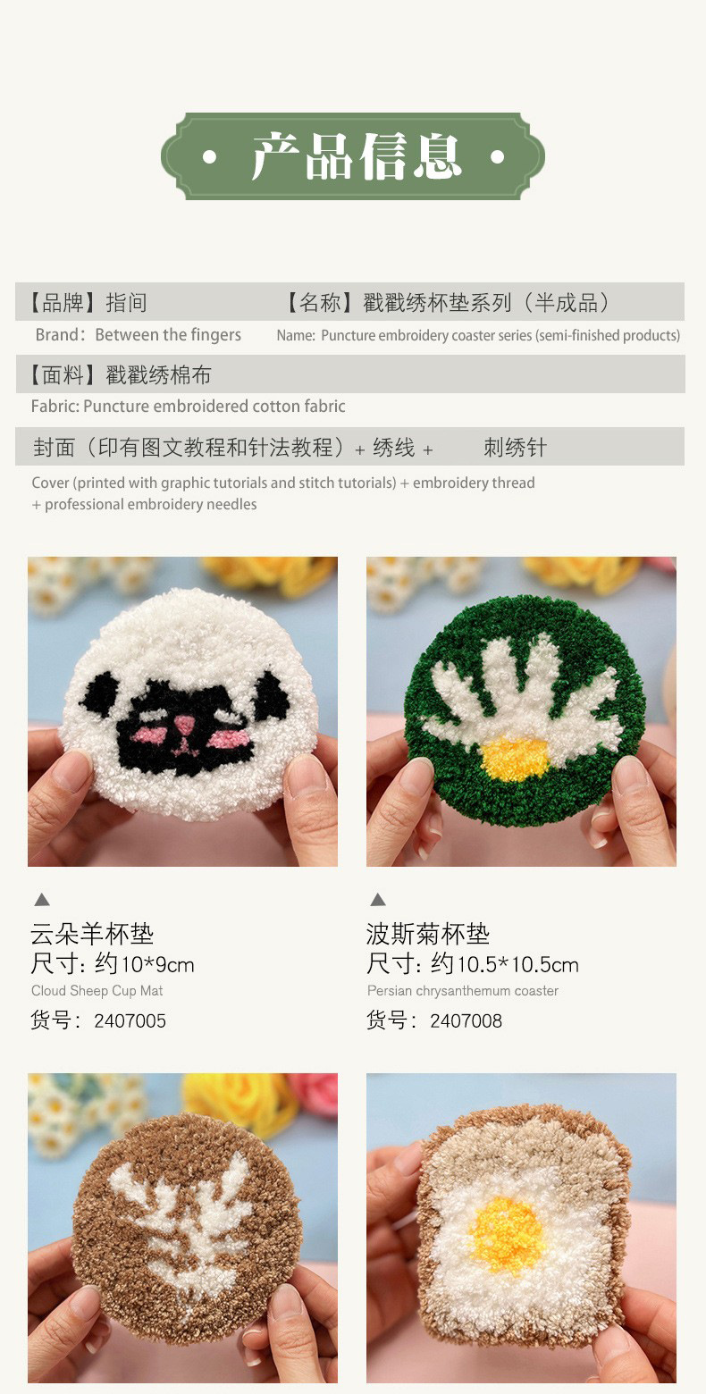 | Colores | Posavasos bordados pinchados-Yunduo Sheep (productos no terminados),Posavasos bordados pinchados-Cosmos (productos no terminados),Posavasos bordados pinchados-Lavado (productos no terminados),Posavasos bordados pinchados-rebanadas de pan (productos no terminados),Posavasos de bordado de pinchazo-guirnalda Xingyu (producto no terminado),Posavasos bordados de pinchar: deseo de calcetines de algodón (productos no terminados),Posavasos de bordado de pinchado: regalo Qimeng (producto no terminado),Posavasos bordados de pinchazo: dulce sombra de pan de jengibre (producto no terminado) |