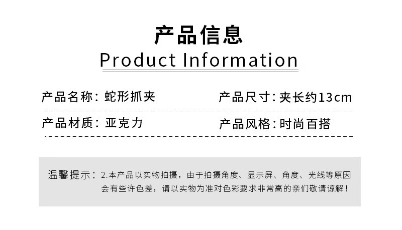 | Color | 9#奶油白11cm,1#黑色方形夹10.5cm,4#深咖方形夹10.5cm,3#浅粉色7cm,7#黑色又字夹11cm,1#透明11cm,10#深咖又字夹11cm,9#咖色又字夹11cm,8#亮面奶白8.5cm,10#米白色大方块 10.5cm,11#磨砂黑色方形抓夹12.5cm,5#磨砂黑蝴蝶结抓夹11.5cm,6#紫色7cm,11#咖色-D字9cm,6#深咖色蝴蝶结抓夹11.5cm,3#咖色方形夹10.5cm,5#米灰方形夹10.5cm,8#浅咖色蝴蝶结抓夹11.5cm,11#米灰又字夹11cm,3#浅咖啡11cm,6#透明大方块10cm,10#亮面黑色 8.5cm,1#果冻粉8.5cm,6#灰蓝方形夹10.5cm,9#咖色-麻花11cm,黑色高亮珍珠13cm,2#咖色(11cm),2#浅蓝方形夹10.5cm,8#浅蓝又字夹11cm,12#灰蓝又字夹11cm,13#卡其又字夹11cm,14#藕紫色方形夹10.5cm,15#咖又字夹13CM,16#咖色方形夹13CM,17#白色方形夹10.5CM,1#深咖色14cm,3#黑色14cm,2#玳瑁11cm,4#深灰色11cm,5#浅绿色11cm,6#韩粉色11cm,7#黑色11cm,10#龙骨白色11cm,11#龙骨黑色11cm,12#龙骨透明色11cm,14#龙骨香槟透明色11cm,15#龙骨琥铂色11cm,1#蝴蝶结抓夹-渐变蓝黑11.5cm,3#蝴蝶结抓夹-渐变咖色-11.5cm,4#蝴蝶结抓夹-渐变黑紫11.5cm,7#卡其茶色蝴蝶结抓11.5cm,1#卡其色八字抓夹8.5cm,2#咖色八字抓夹8.5cm,3#奶茶色八字抓夹8.5cm,4#黑色八字抓夹8.5cm,1#黑色13CM,3#浅咖13CM,4#咖色13CM,1#深咖13cm,4#黑色13cm,1#绿色7cm,2#橘色7cm,4#玫红色7cm,5#黄色7cm,7#白色7cm,8#黑色7cm,9#米白色7cm,1#深咖色-13cm,3#黑色-13cm,4#咖色-13cm,1#黑色(11cm),3#藏青色(11cm),4#卡其色(11cm),5#浅咖色(11cm),6#浅紫色(11cm),7#米白色(11cm),1#龙骨-咖色11cm,2#龙骨-米色11cm,3#米色-一字11cm,4#米色-花朵7cm,5#咖色-花朵7cm,6#米色-方形6cm,7#咖色-方形6cm,8#米色-麻花11cm,10#米色-篱笆11cm,12#米色-D字9cm,13#咖色-饺子11cm,16#咖色一字款11cm,8#灰色大方块12.5CM,10#咖色交叉13CM,11#白色交叉13CM,12#卡其色交叉13CM,1#透明D字夹9cm,2#黑色D字夹9cm,3#琥珀色D字夹9cm,4#米白色D字夹9cm,8#黑色大方块10cm,1#不规则灰色抓夹11cm,2#不规则咖色抓夹11cm,3#不规则卡其抓夹11cm,4#不规则白色抓夹11cm,5#不规则米黄抓夹11cm,6#不规则黑色抓夹11cm,7#不规则深咖抓夹11cm,6#亮面黑色min-约11cm,7#亮面黑色min-约13cm,8#磨砂又字min-约13cm,9#磨砂衣架min-约13cm,20#磨砂又字mim11cm,8#灰色大号抓夹12.5cm,9#浅粉色大号抓夹12.5cm,10#米白色12.5cm,14#磨砂深蓝方形抓夹12.5cm,16#磨砂咖色方形抓夹12.5cm,17#果冻淡黄方形抓夹12.5cm,1#紫色爱心抓夹8.5cm,2#米色爱心抓夹8.5cm,3#灰绿爱心抓夹8.5cm,4#浅橘色爱心抓夹8.5cm,7#紫色爱心抓夹加大-13cm,8#粉色爱心抓夹加大-13cm,9#灰绿爱心抓夹加大-13cm,10#浅橘爱心抓夹加大-13cm,1#磨砂黑色min15cm,2#磨砂黑色方块15cm,3#磨砂黑色爱心15cm,4#磨砂珍珠15cm,5#双爱心15cm,6#小珍珠15cm,7#亮面珍珠夹15cm,8#琥珀色亮面珍珠夹15cm,3#果冻绿8.5cm,4#果冻蓝8.5cm,5#果冻橘8.5cm,6#果冻灰8.5cm,7#果冻黄8.5cm,9#亮面浅粉8.5cm,11#亮面墨绿8.5cm,1#黑色9cm,2#白色9cm,1#黑色又字15CM,2#白色又字夹15CM,3#深棕又字夹15CM,7#蛇骨-深棕13CM,5#黑色大爱心又字夹-13CM,1#果冻米色13CM,2#果冻咖色13cm,3#果冻灰色13CM,4#(大号)米白色透明爱心抓夹13cm,6#(大号)浅绿色透明爱心抓夹13CM,9#(中号)咖色透明爱心抓夹8cm,13#(中号)粉色透明爱心抓夹8cm,1#奶白色亮面10.5cm,2#柠檬绿10.5cm,3#玫红色10.5cm,4#紫灰(深灰)10.5cm,5#黄色10.5cm,6#绿茵蓝10.5cm,7#果冻白10.5cm,8#肉粉10.5cm,9#少女粉10.5cm,11#黑色亮面10.5CM,12#青色亮面10.5CM,1#琥珀 约14cm,2#透茶 约14cm,3#亮黑 约14cm,1#粉色13cm,2#紫色13cm,3#蓝色13cm,4#绿色13cm,5#黄色13cm,1#芋泥色15cm,2#亮面玳瑁15cm,3#经典黑15cm,4#巧克力色15cm,1#粉色14cm,2#白色14cm,3#绿色14cm,1#酒红色(8cm),2#豆沙粉(8cm),10#紫色8cm,11#米咖花朵抓夹8cm,1#安可拉红大号抓夹12.5cm,1#黑色8cm,2#白色8cm,3#深咖8cm,4#浅咖8cm,1#黑色9.5cm,2#深咖色9.5cm,3#米咖色9.5cm,4#亮琥珀9.5cm,5#亮黑色9.5cm,6#亮黄色9.5cm,1#蓝色爱心波浪抓夹10.5cm,2#米色爱心波浪抓夹10.5cm,1#粉紫色12cm,2#白色12cm,3#黑色12cm,4#焦糖咖12cm,1#安可拉红13cm,3#咖色爱心抓夹13cm,7#黑色珍珠13cm,5#透色菊花夹-灰槟13cm,1#【方块款/豹纹灰】约10.5cm,2#红色珍珠撞色抓夹10.5cm,3#金标S款13厘米抓夹,1#【简约透灰】珠珠大号抓夹13cm,2#【磨砂黑】珠珠大号抓夹13cm,3#【亮面黑】珠珠大号抓夹13cm,4#【焦糖色】珠珠大号抓夹13cm,5#【磨砂咖】珠珠大号抓夹13cm,1#大号茶色猫咪抓夹13cm,5#磨砂黑色13cm,1#1件套【亮黑色】约13.3cm,2#1件套【亮棕色】约13.3cm,3#1件套【茶灰色】约13.3cm,1#渐变蓝绿11cm,2#渐变玫红11cm,3#渐变黄11cm,4#渐变粉11cm,5#渐变紫11cm,1#棕色晕染双珠12.5cm |