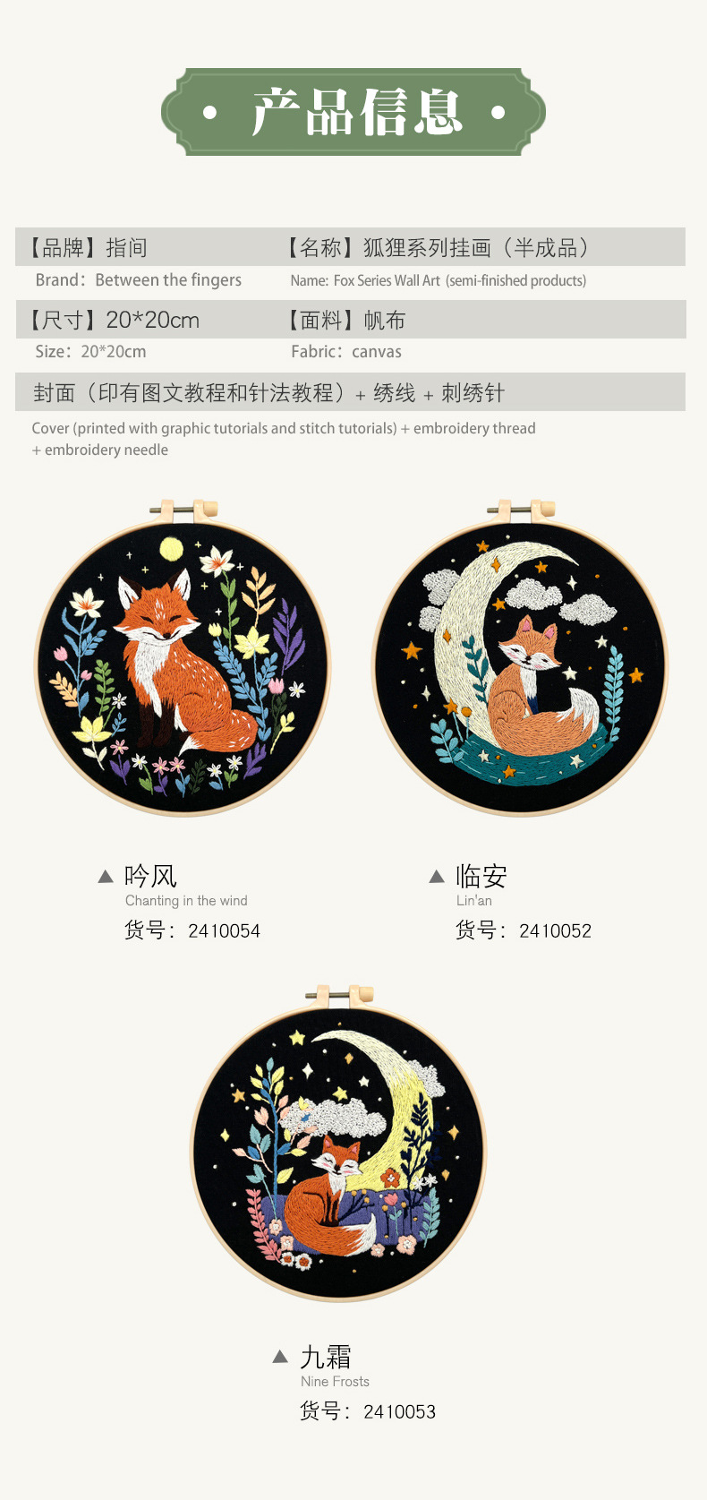 | Color | Pintura colgante de zorro pequeño - Yin Feng (no terminada), pintura colgante de zorro pequeño - Lin 'an (no terminada), pintura colgante de zorro pequeño - nueve heladas (no terminadas), conjunto de tres piezas de bordado de zorro pequeño (yin Feng + lin' an + nueve heladas) + tijeras rosas 1 + hilo de flores 1 |