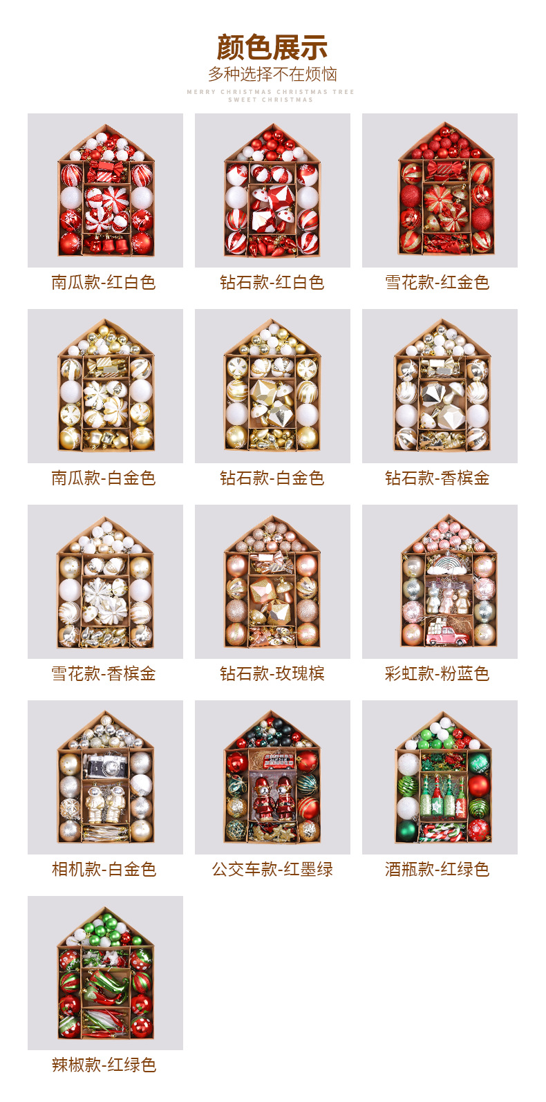 | Color | Estilo diamante-rojo y blanco,Estilo diamante-oro blanco,Diamante-oro champán,Diamante-Rosa,Estilo calabaza-rojo y blanco,Estilo calabaza-blanco y oro,Estilo copo de nieve-rojo y oro,Estilo copo de nieve-oro champán,Modelo de cámara-blanco y oro,Estilo Arco Iris-Rosa Azul,Modelo de autobús-rojo y verde oscuro,Estilo de botella de vino-rojo y verde,Chili-rojo y verde |
