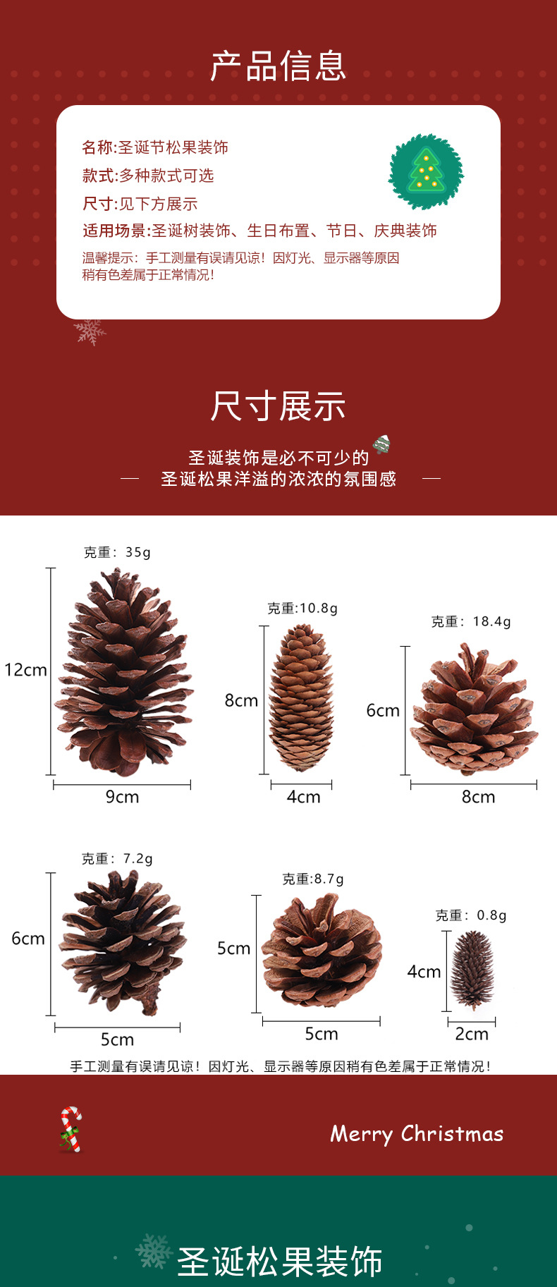 | Color | Mini pino (4-5cm) aproximadamente 0,8G,Bendipine (5-6cm) alrededor de 8g,Bendipine (6-7cm) alrededor de 7g,Pino Bendi (7-8cm) alrededor de 18g,Pine_spruce blanco (8-9cm) sobre 10g,Pino americano (10-12cm) alrededor de 35g |
