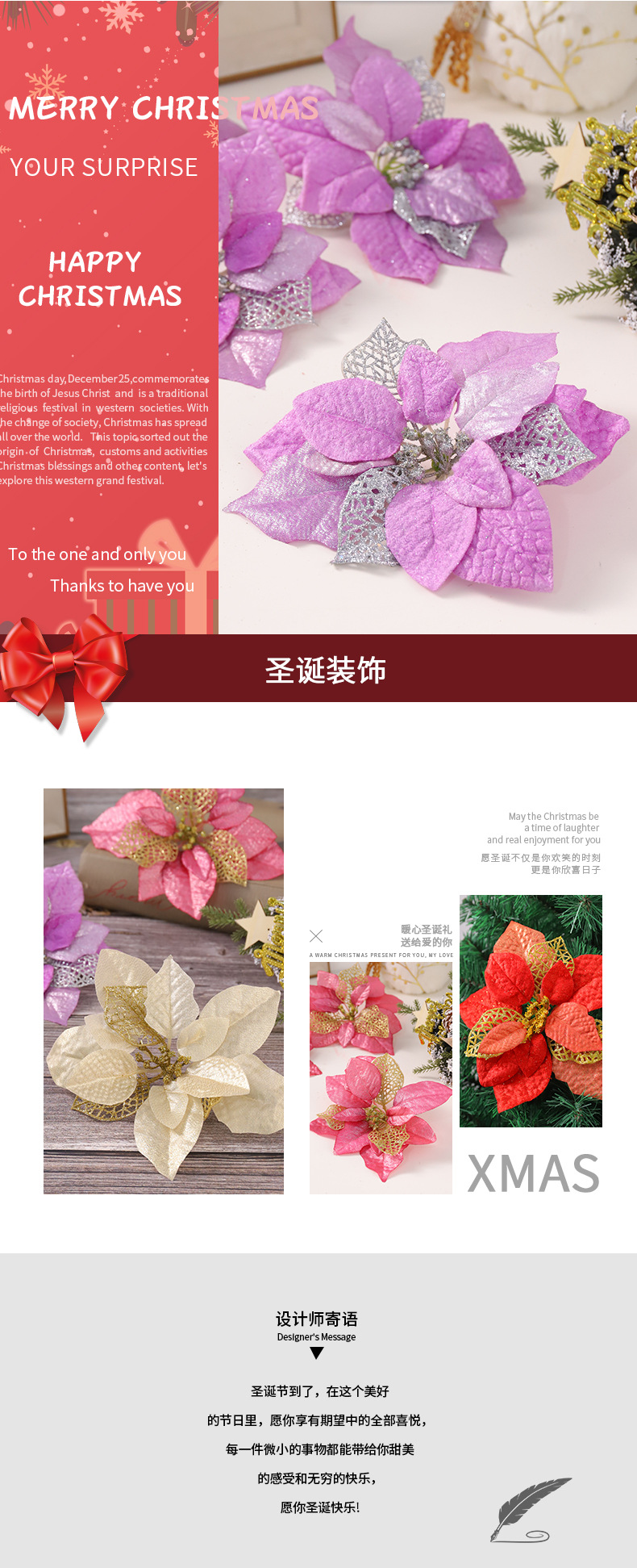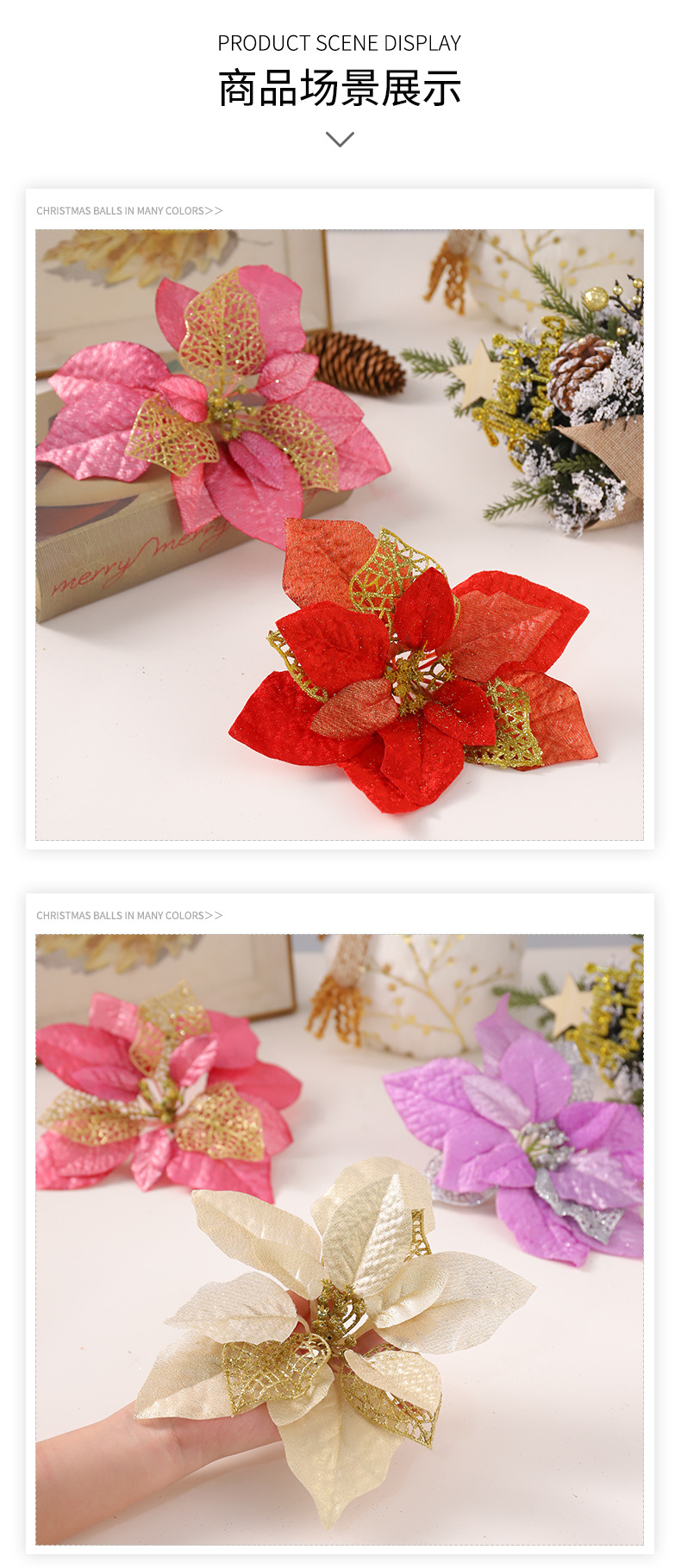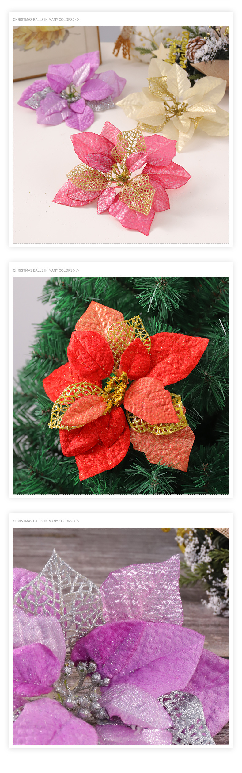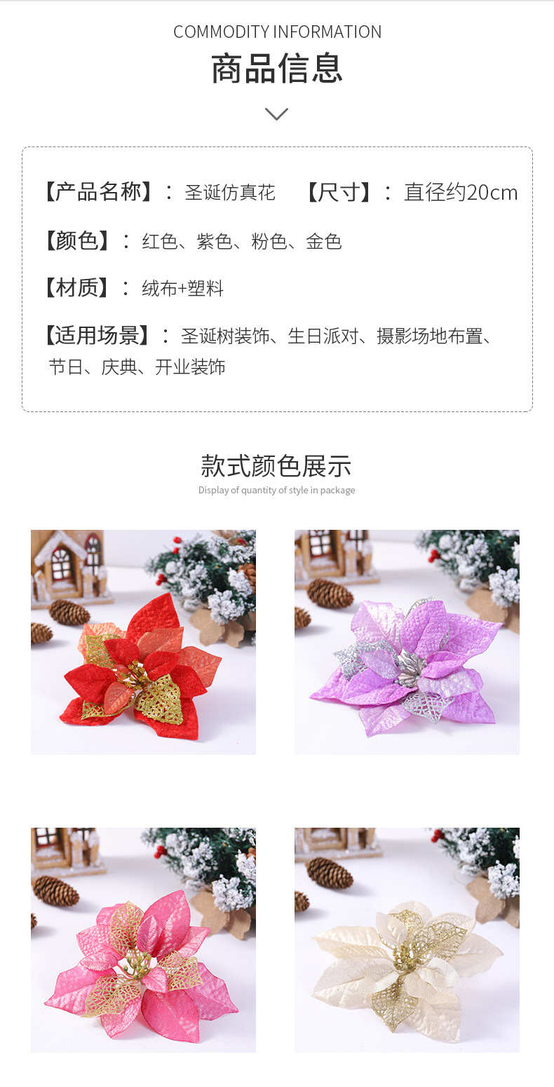 | Color | Flores de Navidad rosas (unos 20 cm de diámetro), flores de Navidad rojas (unos 20 cm de diámetro), flores de Navidad doradas (unos 20 cm de diámetro), flores de Navidad moradas (unos 20 cm de diámetro) |