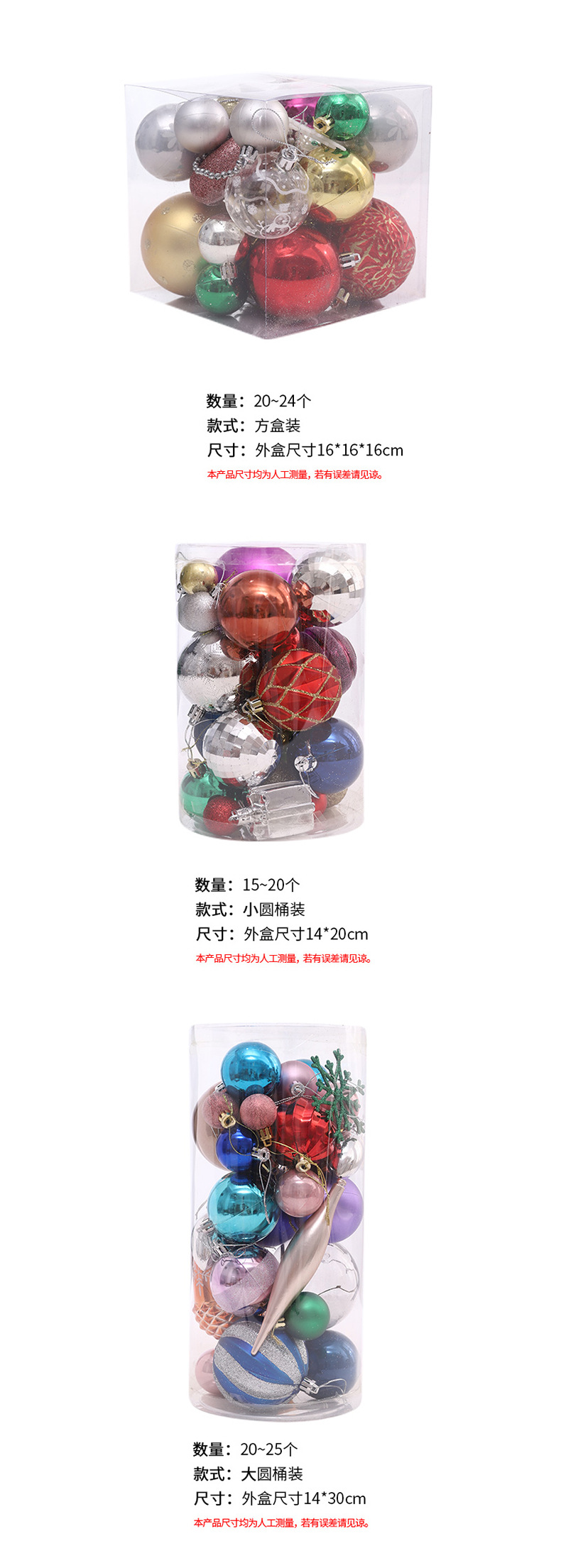 | Color | Set de bolas de Navidad de caja cuadrada (al azar),Conjunto de bolas de Navidad de barril redondo pequeño (aleatorio),Conjunto de bolas de Navidad de barril redondo grande (aleatorio) |
