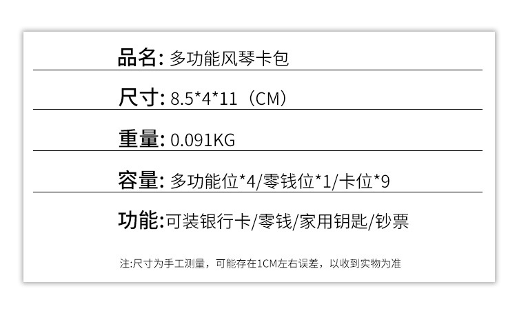 | Especificación | Tarjetero pequeño con doble tirador en forma de acordeón |