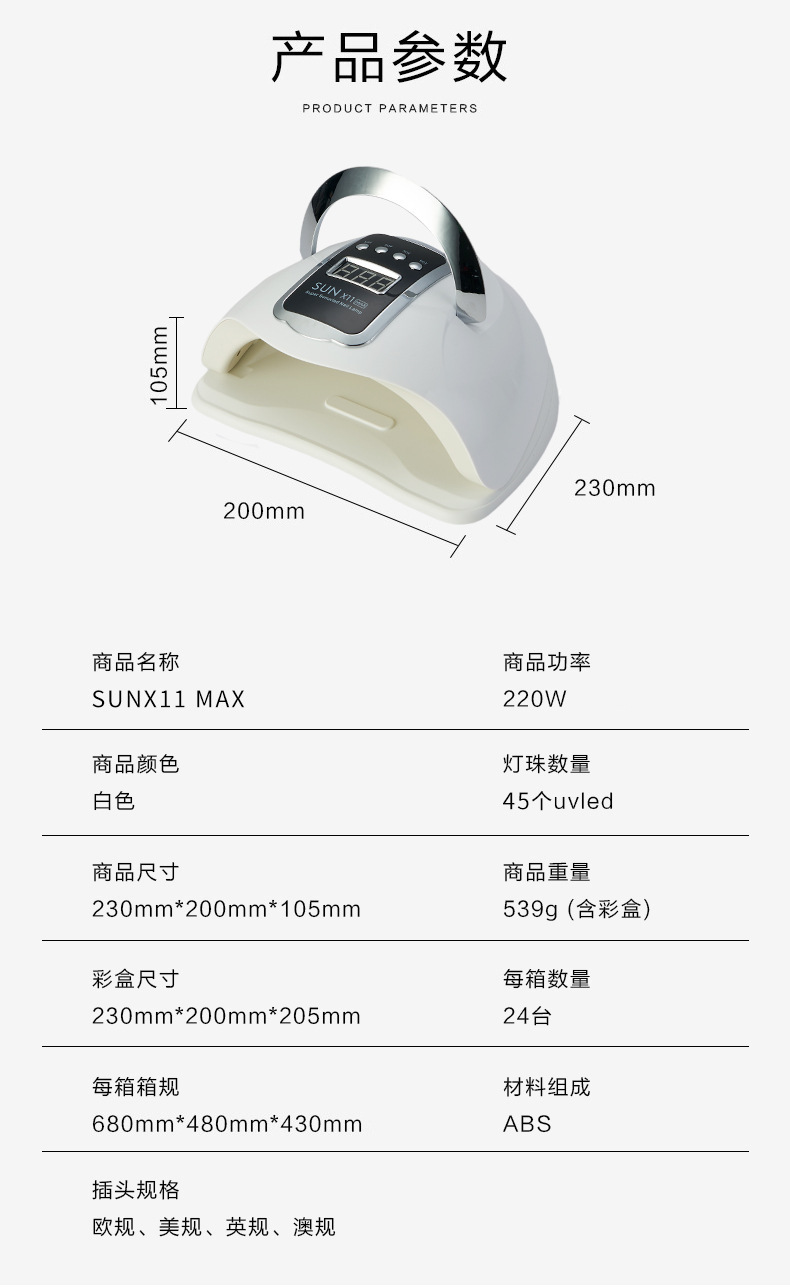 | Especificaciones | 45 perlas de lámpara Sunx6max - Enchufe US (apto para China, Estados Unidos, Japón y otros países),45 perlas de lámpara Sunx6max - Enchufe europeo (apto para Alemania, Francia, Rusia, Corea del Sur y otros países),45 perlas de lámpara Sunx6max - Enchufe UK (apto para Reino Unido, Singapur, Malasia, India y otros países),45 perlas de lámpara Sunx6max - Enchufe australiano (apto para Australia, Nueva Zelanda y otros países),45 perlas de lámpara Sunx10max - Enchufe US (apto para China, Estados Unidos, Japón y otros países),45 perlas de lámpara sunx10max-enchufe europeo (aplicable a Alemania, Francia, Rusia, Corea del Sur y otros países),45 perlas de lámpara Sunx10max - Enchufe UK (apto para Reino Unido, Singapur, Malasia, India y otros países),45 perlas de lámpara Sunx10max - Enchufe australiano (apto para Australia, Nueva Zelanda y otros países),45 perlas de lámpara Sunx11max - Enchufe US (apto para China, Estados Unidos, Japón y otros países),45 perlas de lámpara Sunx11max - Enchufe europeo (apto para Alemania, Francia, Rusia, Corea del Sur y otros países),45 perlas de lámpara Sunx11max - Enchufe UK (apto para Reino Unido, Singapur, Malasia, India y otros países),45 perlas de lámpara Sunx11max - Enchufe australiano (apto para Australia, Nueva Zelanda y otros países) |