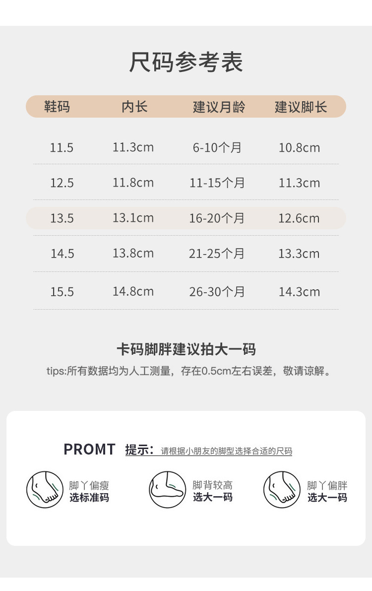 | Tamaño de los calcetines infantiles | 11,5 yardas [longitud interior 11,3 cm] se recomienda 6 - 10 meses, 12,5 yardas [longitud interior 11,8 cm] se recomienda 11 - 15 meses, 13,5 yardas [longitud interior 13,1 cm] se recomienda 16 - 20 meses, 14,5 yardas [longitud interior 13,8 cm] se recomienda 21 - 25 meses, 15,5 yardas [longitud interior 14,8 cm] se recomienda 26 - 30 meses |