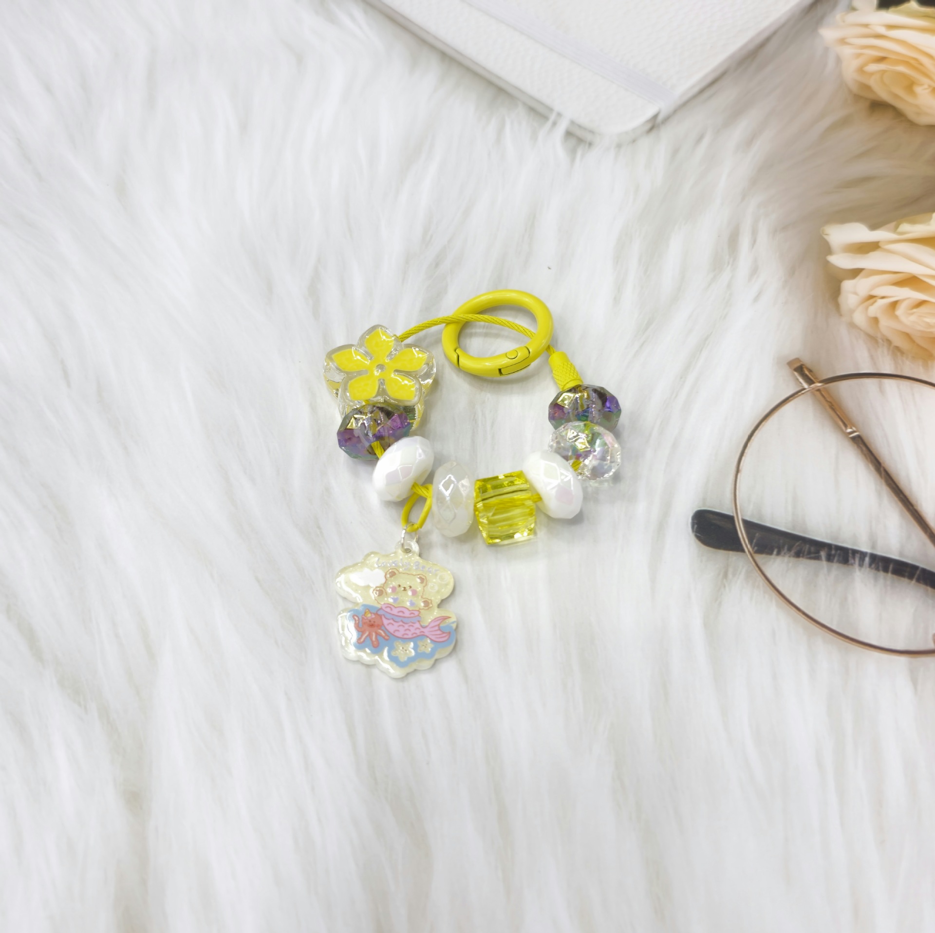 这款产品描述的颜色是花和圆形扣的颜色,其他均随机搭配颜色,下面的卡通吊坠也是随机搭配的,如果介意的亲慎拍!