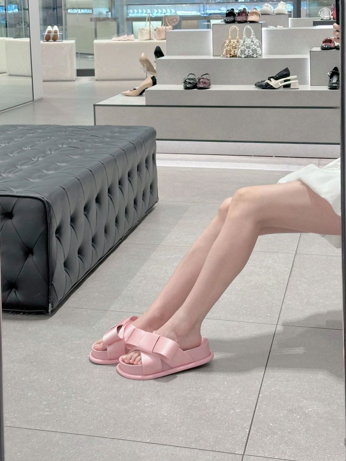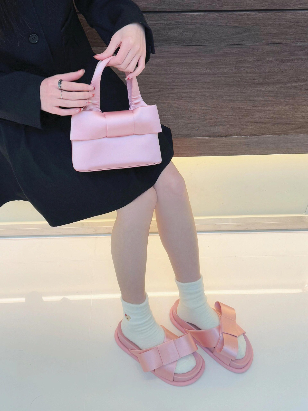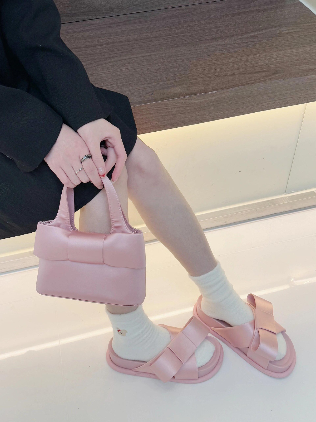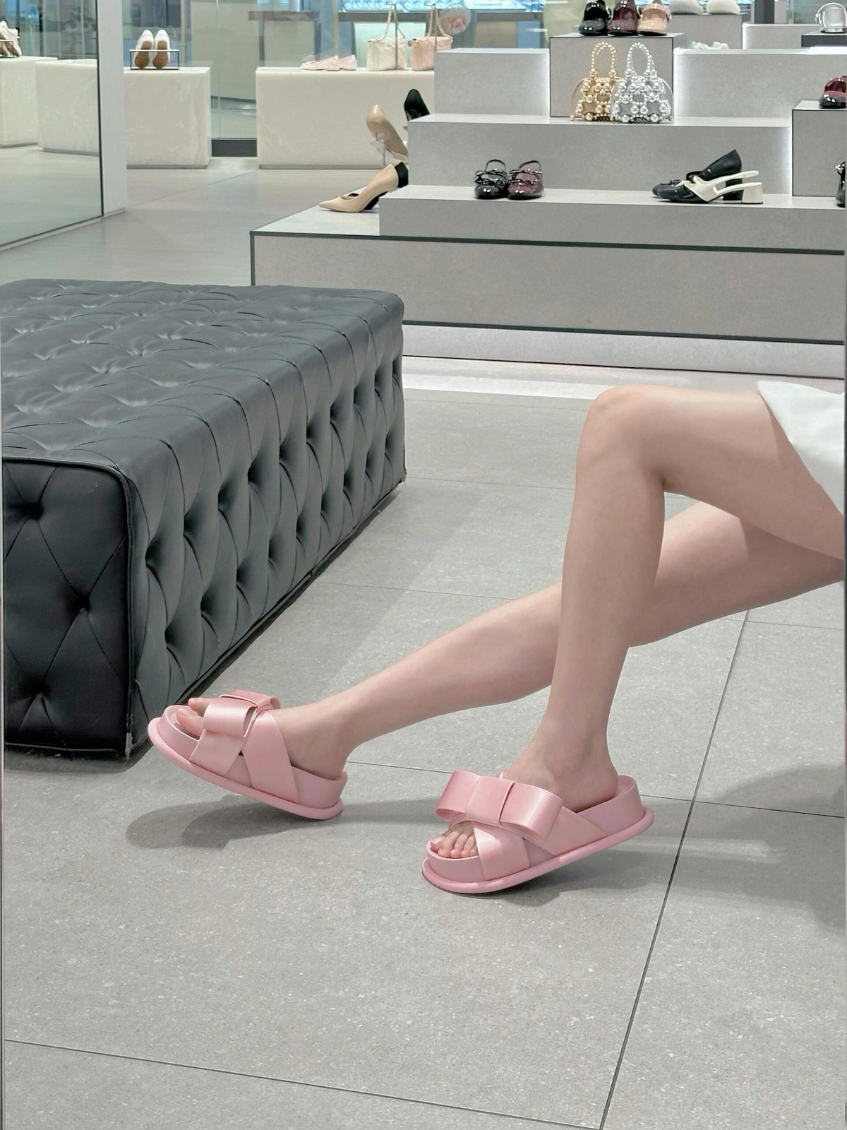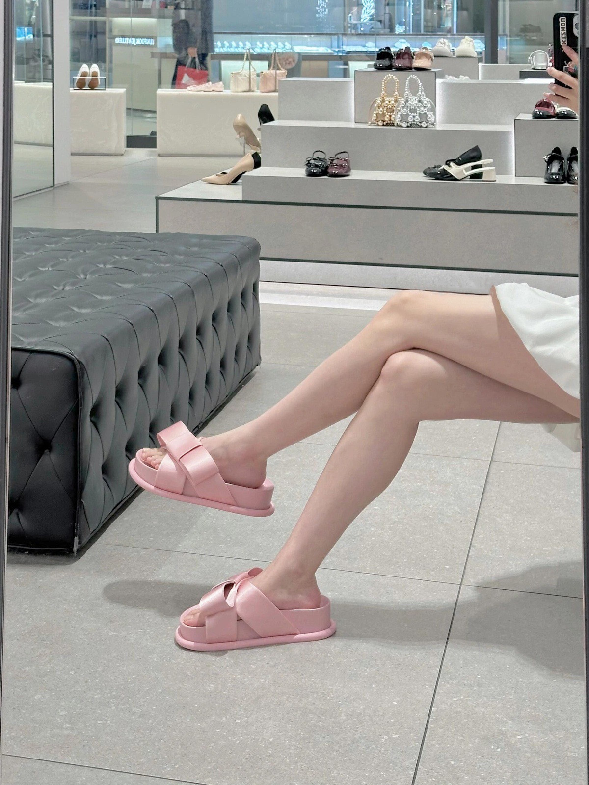 Verano de piel de oveja ~ nuevo arco de cuero grueso fondo zapatillas de una sola palabra para la mujer de la ropa exterior de media altura de tacones altos zapatillas frías