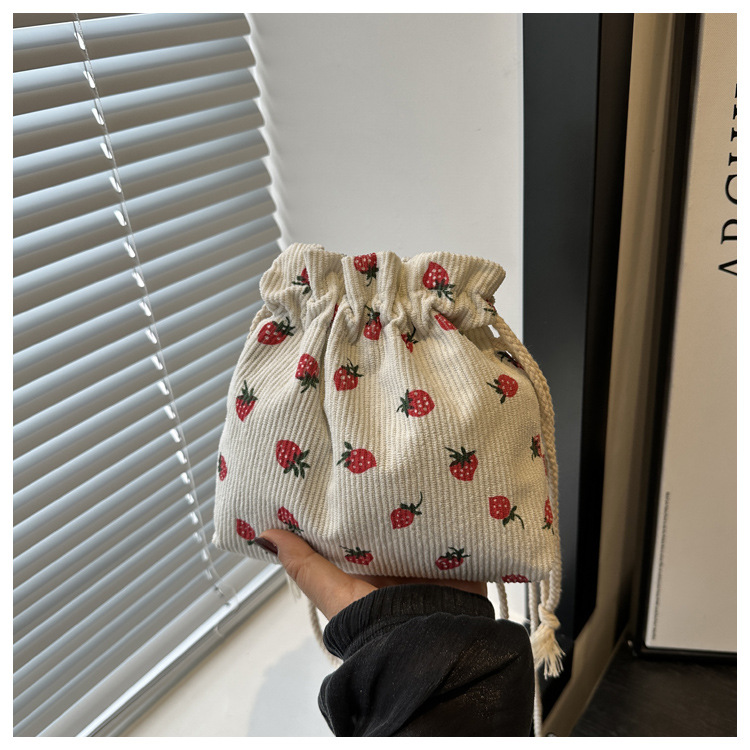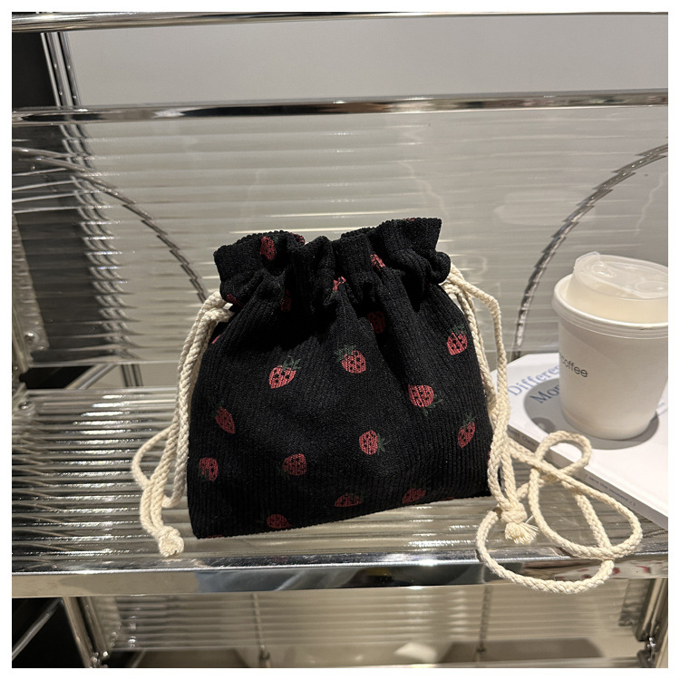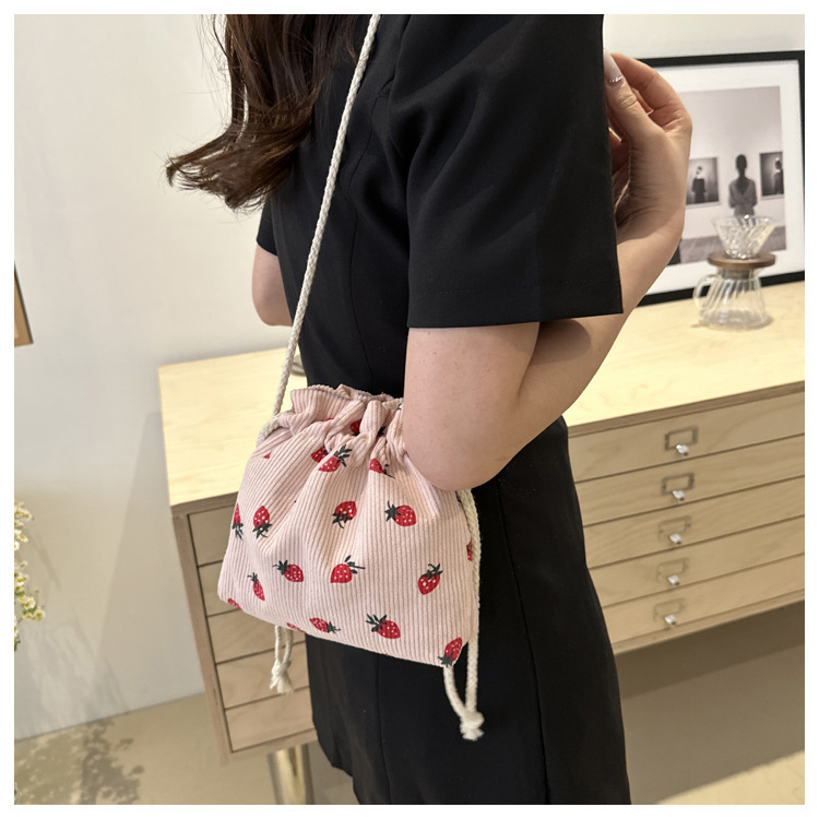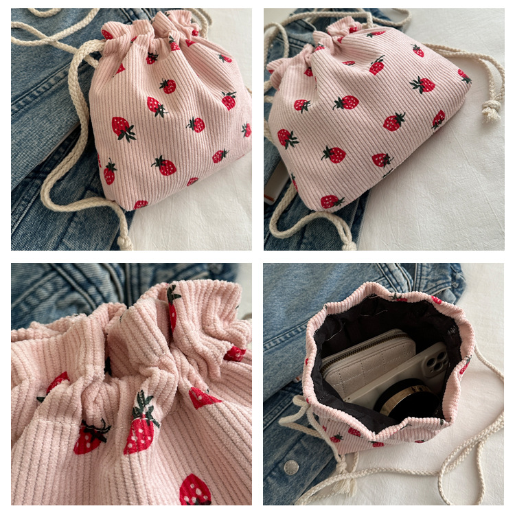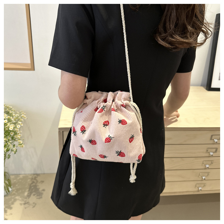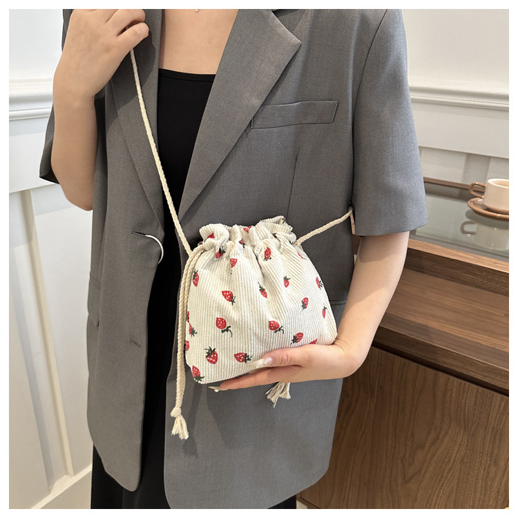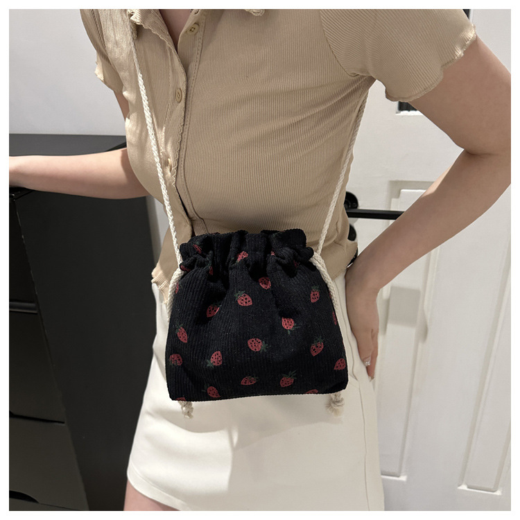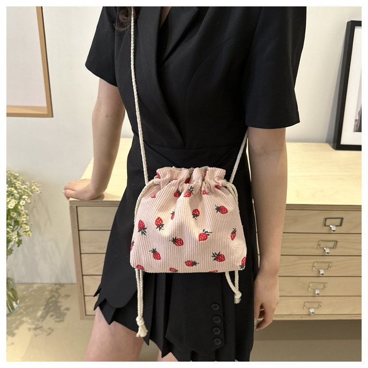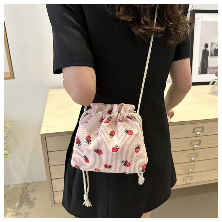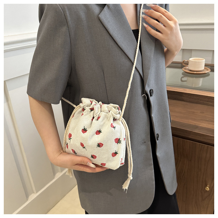 Este año, la moda impresa encantadora fresas mini bolso de balde 2024 nuevo verano versátil mochila de hombro