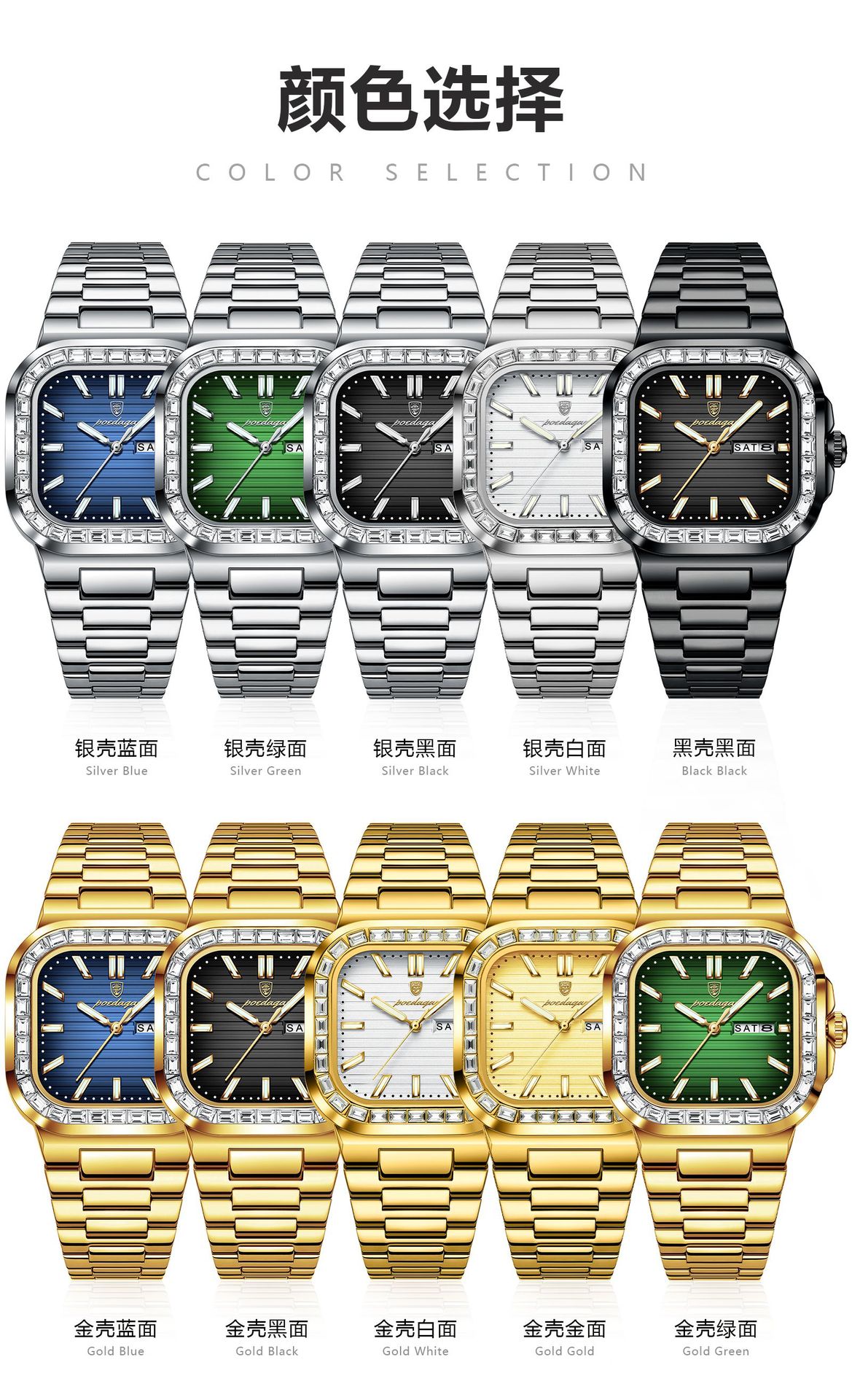 | Colores | Cinta de acero azul con carcasa de plata 975,Cinta de acero de superficie blanca con carcasa de plata 975,Cinturón de acero de superficie negra con carcasa de plata 975,Cinta de acero verde con carcasa de plata 975,975 cinturón de acero de superficie azul con carcasa de oro,975 cinturón de acero blanco con carcasa dorada,975 cinturón de acero de superficie negra con carcasa de oro,975 cinturón de acero verde con carcasa dorada,975 cinturón de acero con carcasa de oro,975 cinturón de acero de superficie negra con carcasa negra |