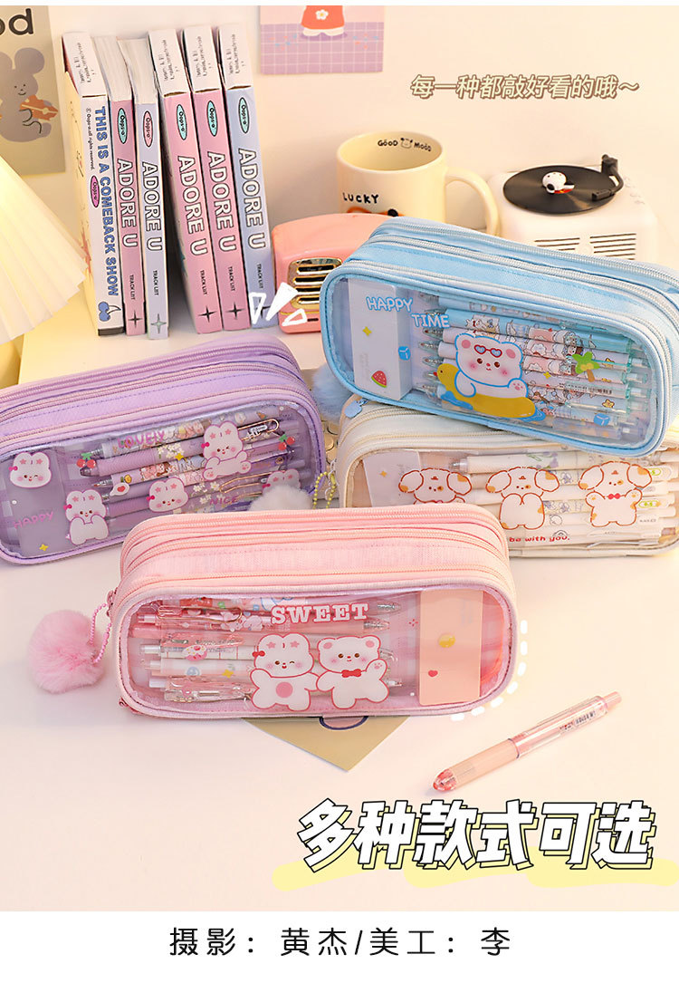 Lindo creativo Bola de piel caja de lápiz estudiante de secundaria de gran capacidad papelería bolsa de papelería de tres capas bolsa de almacenamiento de chica de alto aspecto