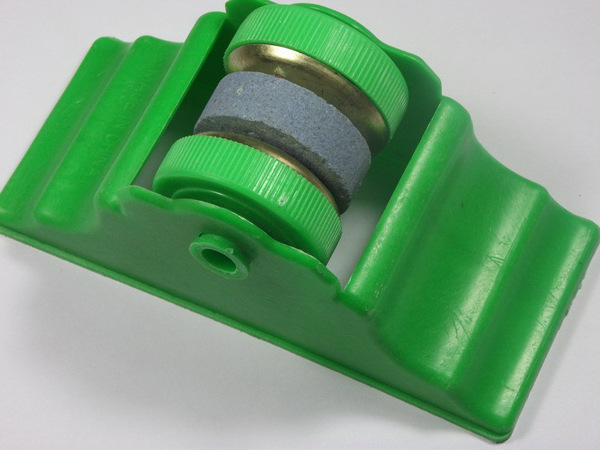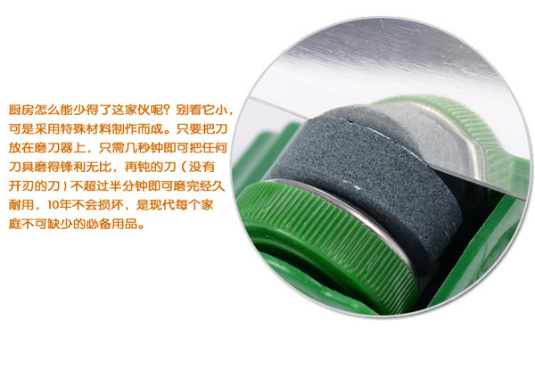 采用特殊材料制作而成。只要把刀放在磨刀器上,只需几秒钟即可把任何刀具磨得锋利无比,再钝的刀(没有开刃的刀)不超过半分钟即可磨完。