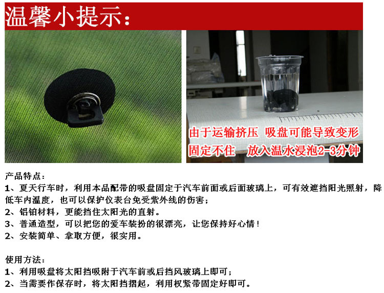 这款用于汽车玻璃的沙遮阳挡适用于各款车型,可帮你的爱车隔离90%以上的阳光;安装非常快捷,只要你停车时轻轻拉起拉环扣在吸盘上即可,两秒时间,清凉一夏!不伤车体,美观实用,价格便宜,是你夏天驾车出门必不可少的用品!