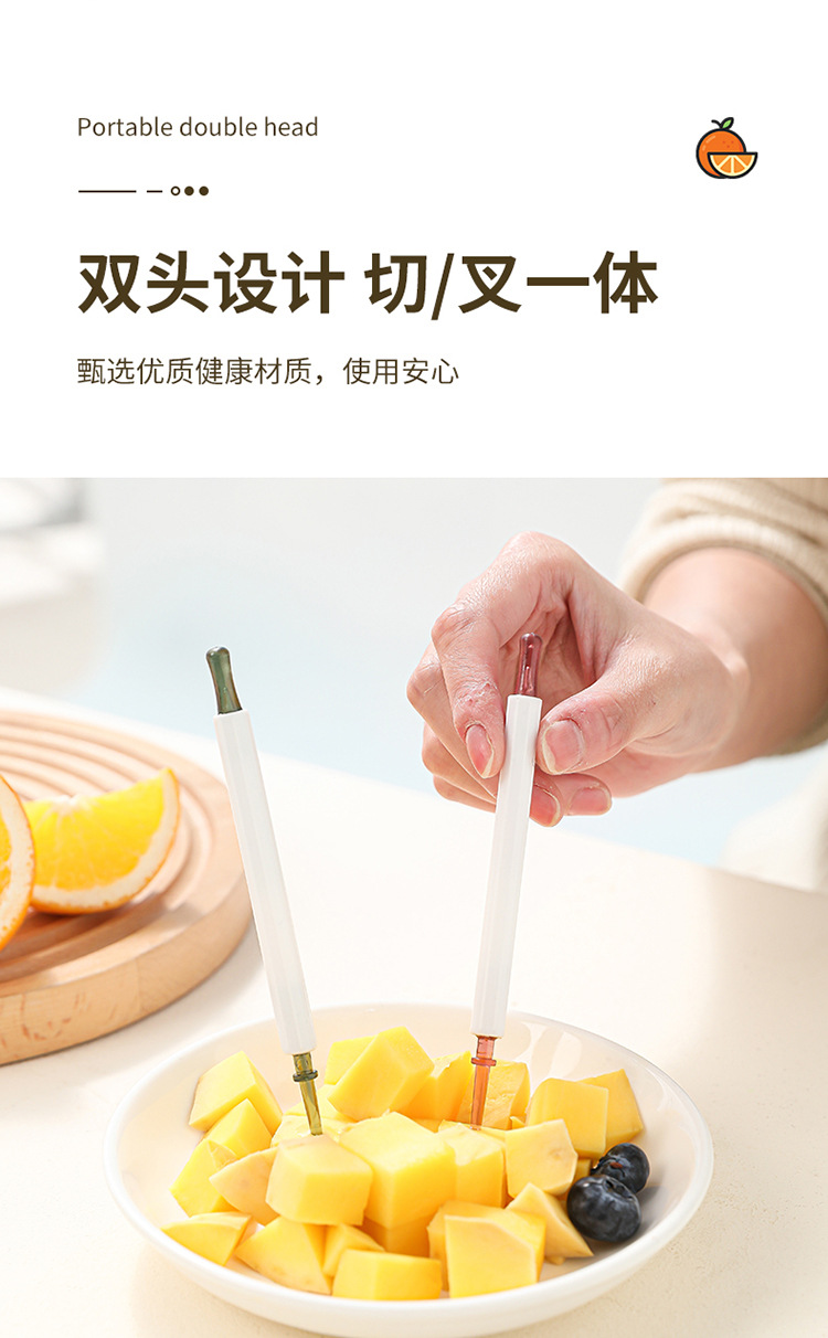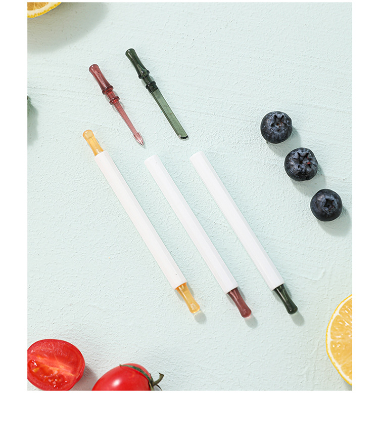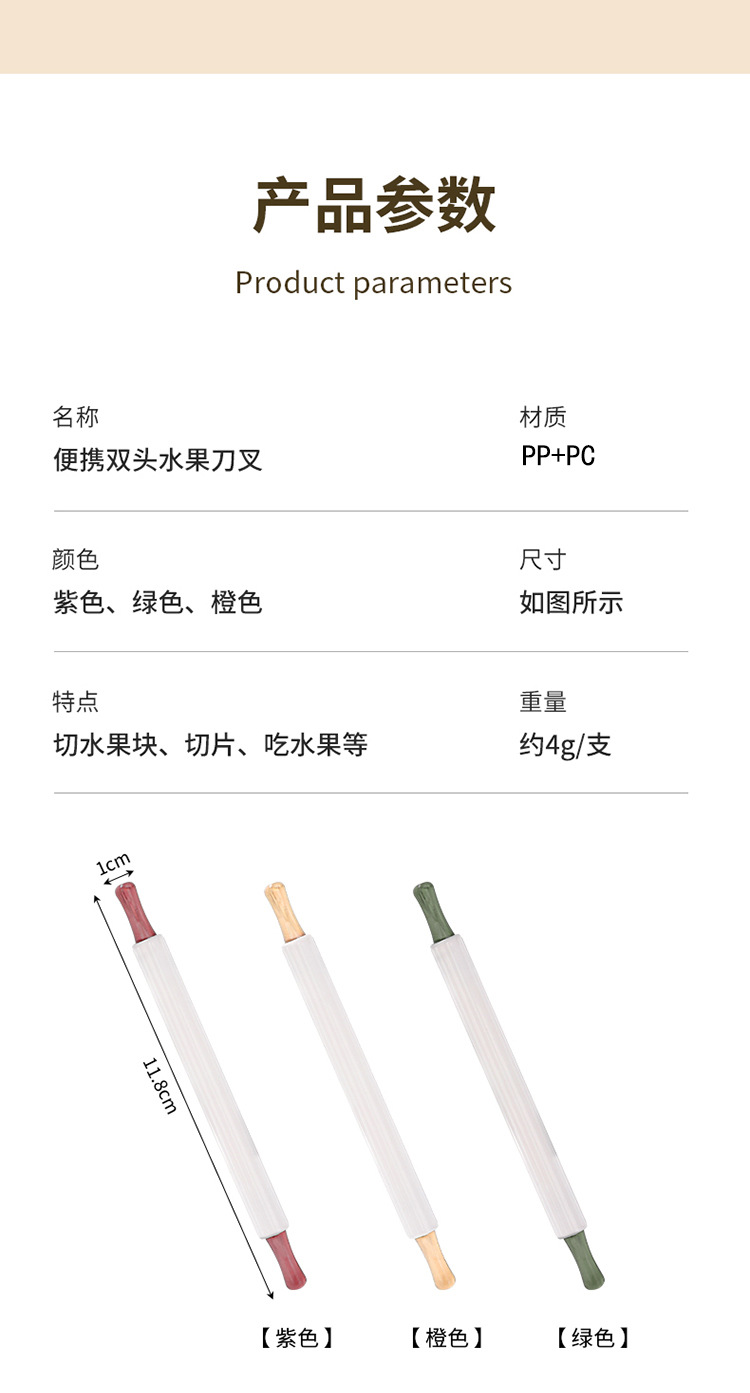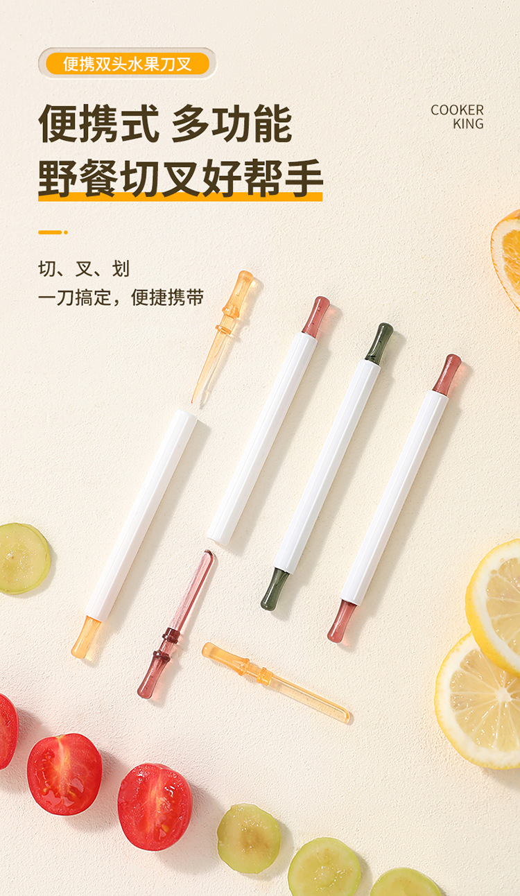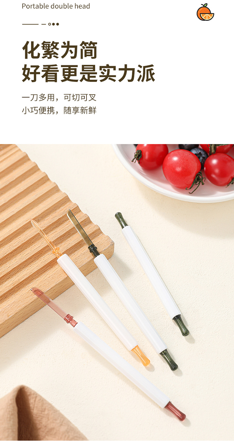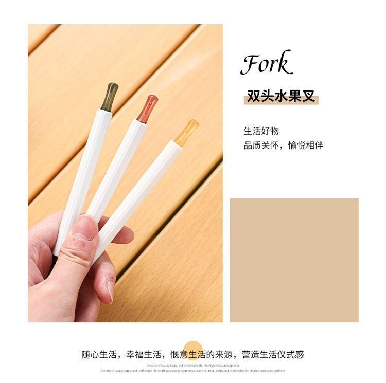 | Especificaciones | Tenedor de frutas de doble cabeza - rojo, tenedor de frutas de doble cabeza - amarillo, tenedor de frutas de doble cabeza - verde |