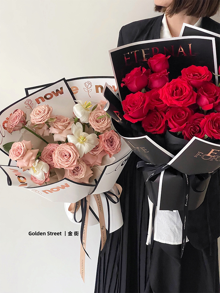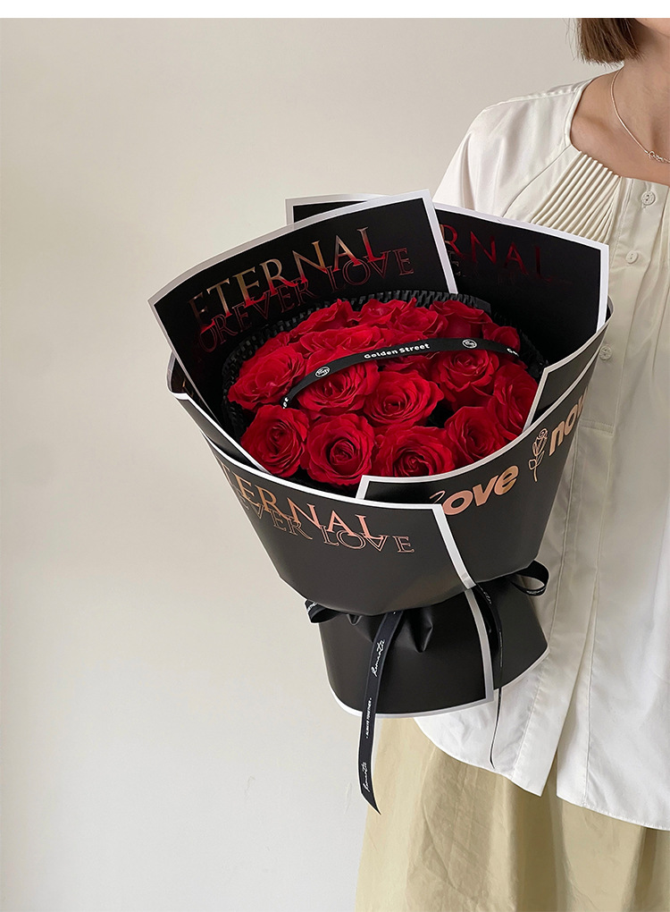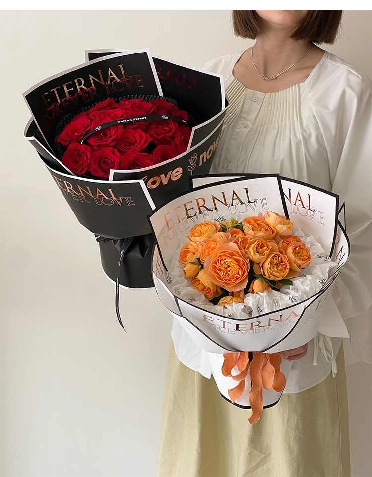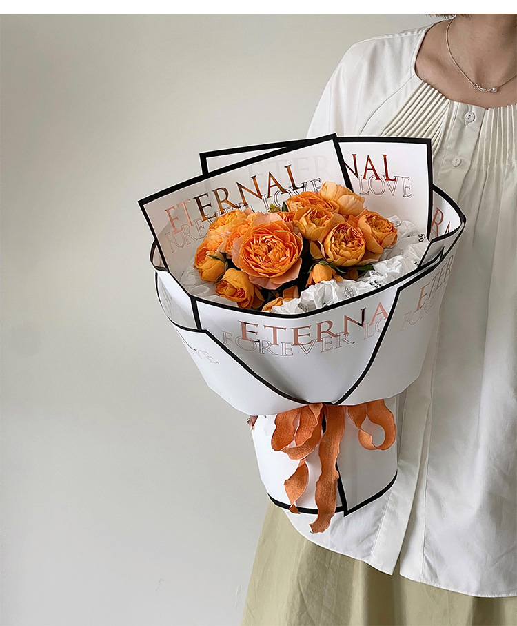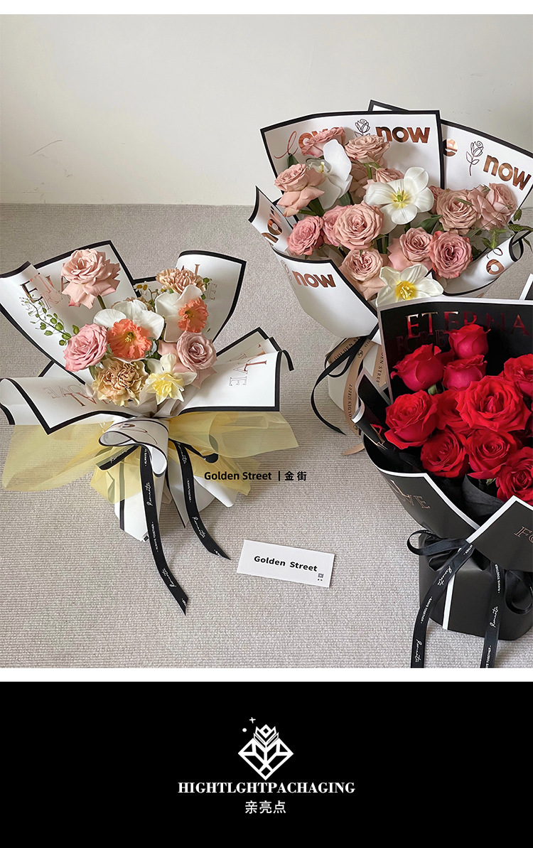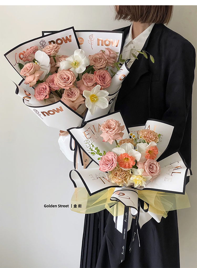 Fábrica al por mayor estilo simple bronceado papel de borde blanco y negro impermeable letras inglesas papel de embalaje de flores papel de embalaje de ramo
