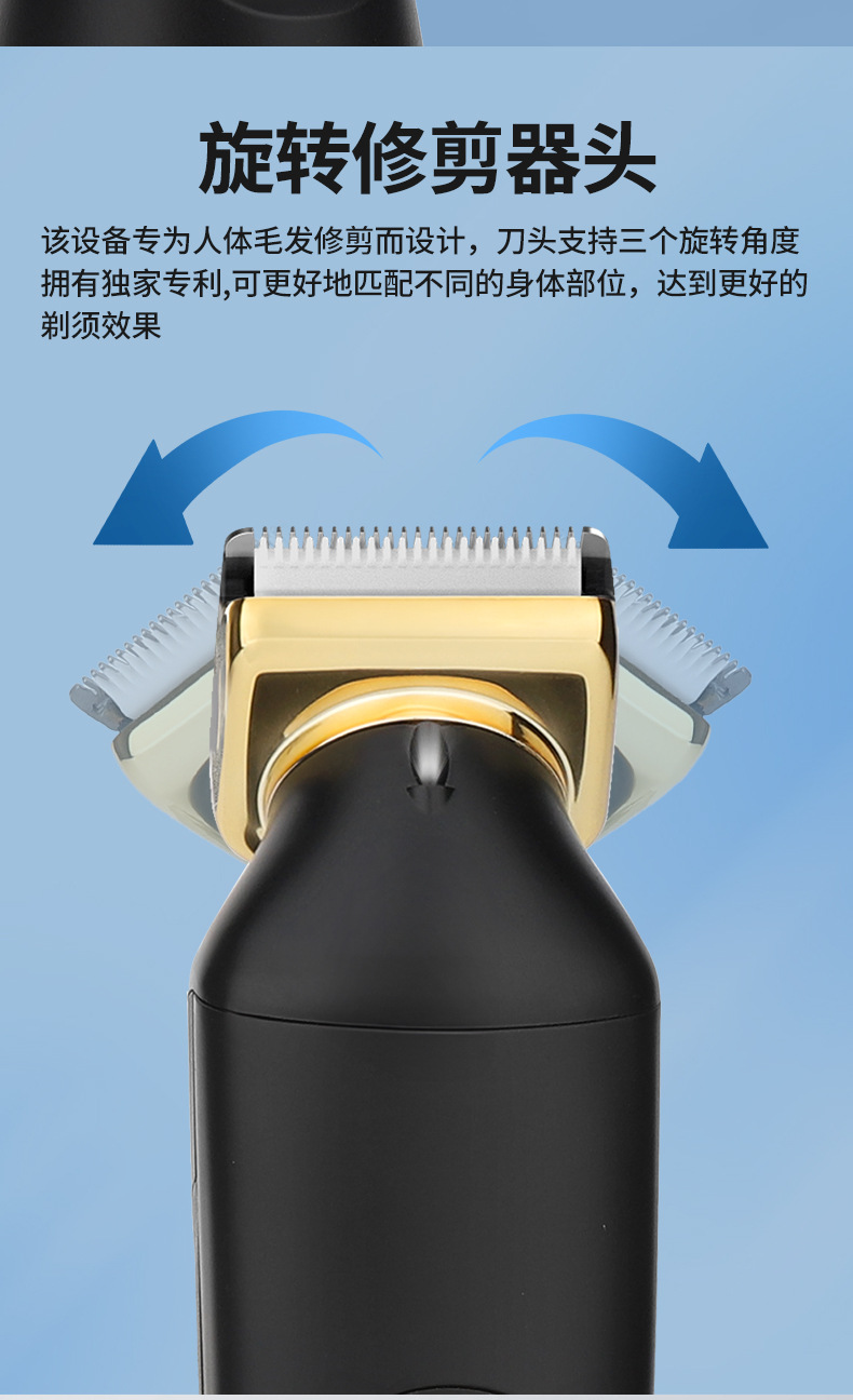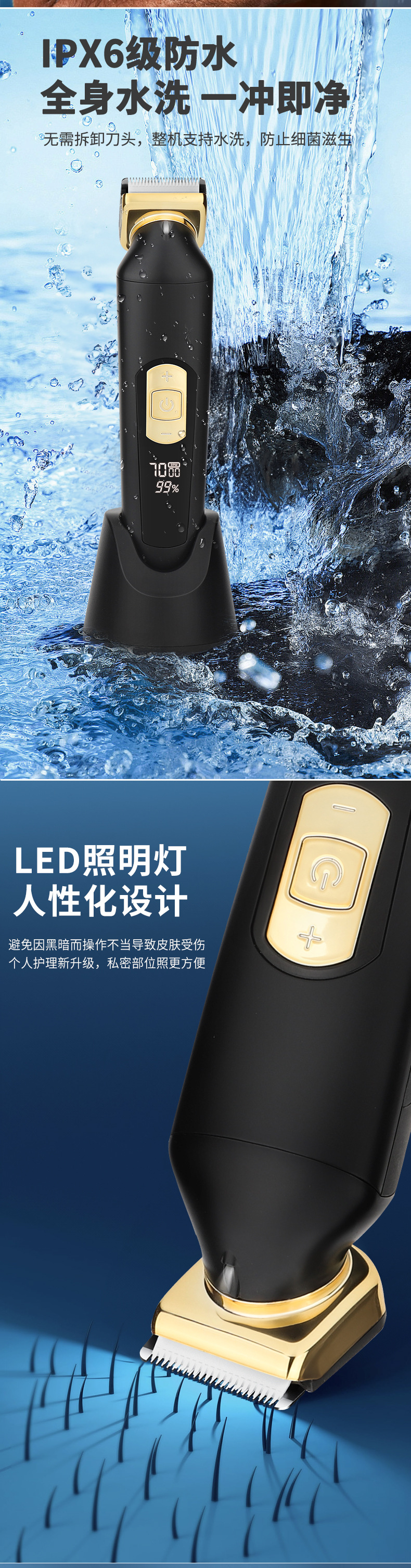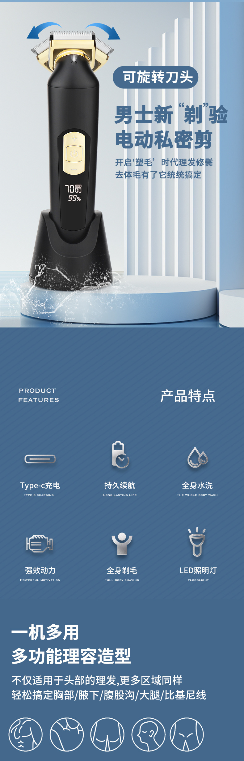 产品特点:液晶电量显示 全身防水 前置LED照片灯 带充电底座 刀头可旋转 转速可调节