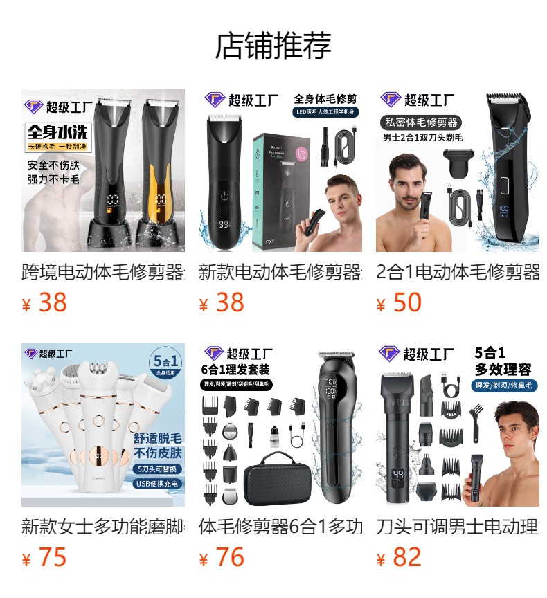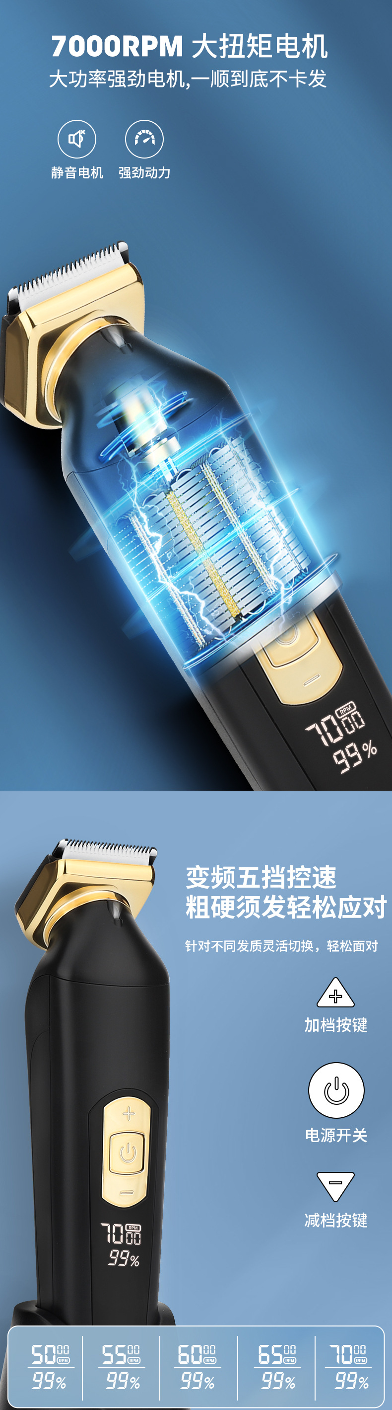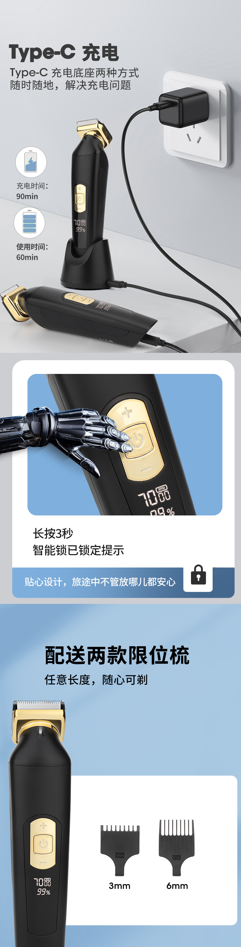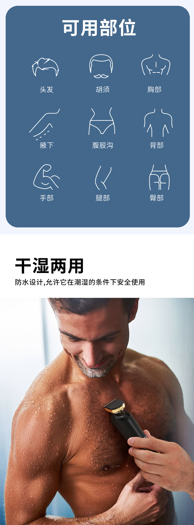 产品特点:液晶电量显示 全身防水 前置LED照片灯 带充电底座 刀头可旋转 转速可调节