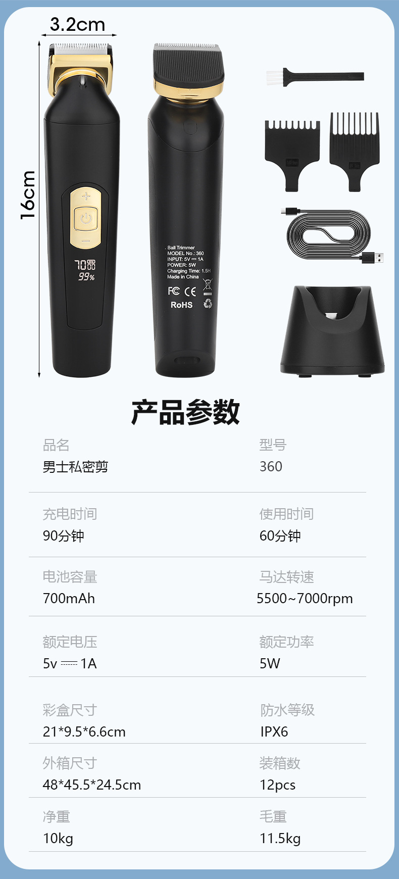 包装:剃毛器*1 充电底座*1 限位梳*2 USB线*1 毛刷*1
