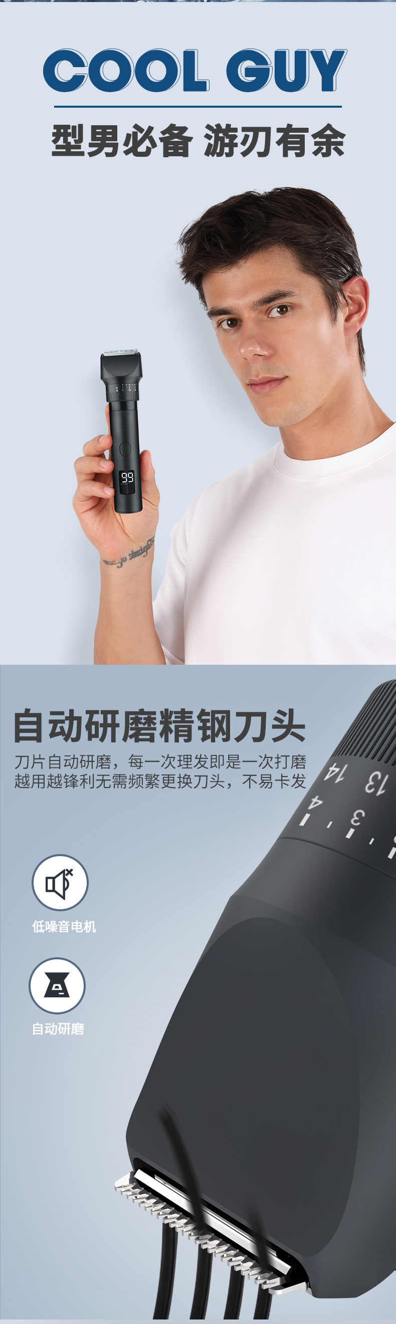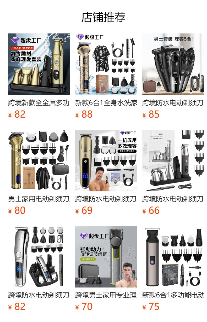 产品包括:主机*1 理发头*1 剃须刀头*1 体毛修剪刀头*1 鼻毛头*1 清洁刷*1 USB充电线*1