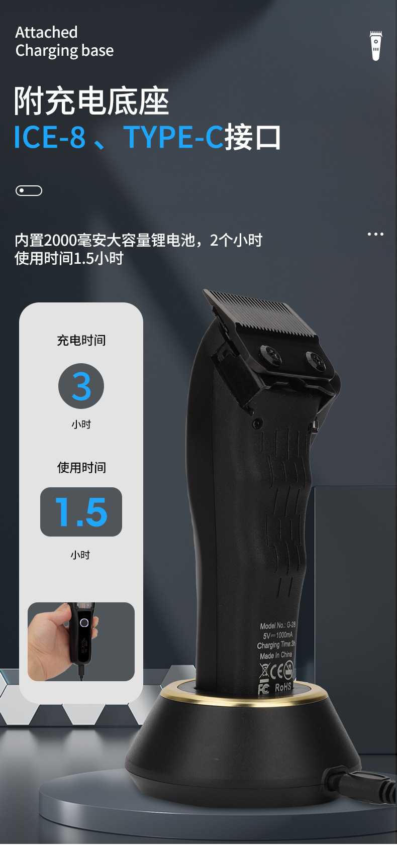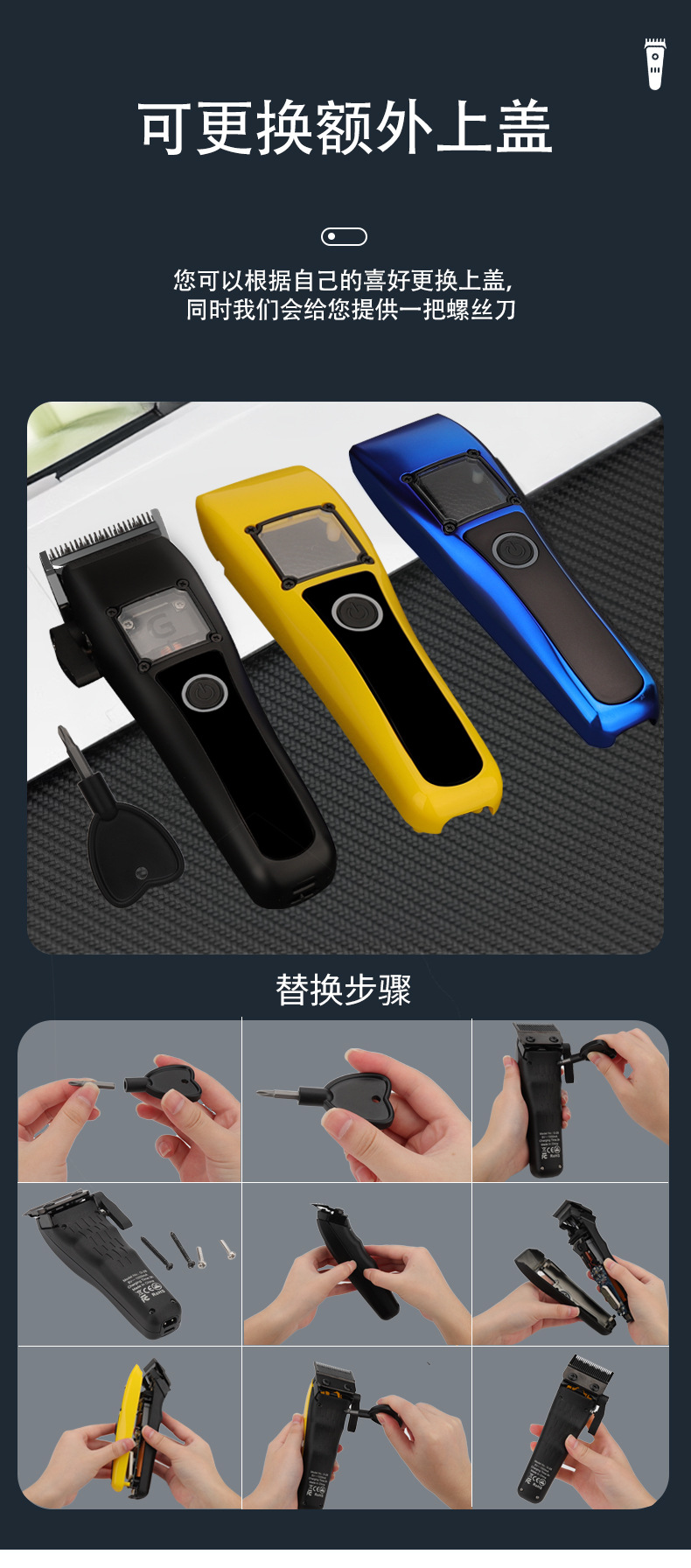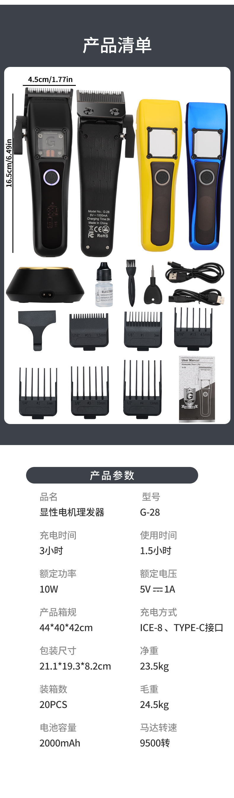 产品配件:主机+USB充电线*2+充电底座+限位梳*6+清洁刷+英文说明书+刀头保护盖+围布+3ml润滑油+说明书+换壳螺丝刀+外壳*2;
