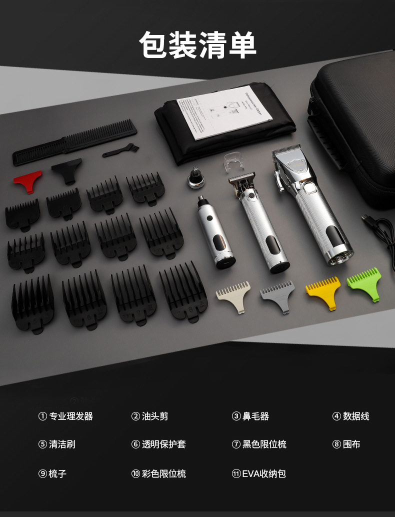 包含配件:鼻毛器*1 大理发器*1 小理发器*1 大限位梳*12 小限位梳*4梳子*1 围布*1 鼻毛头*1 梳子*1 USB充电线*3 清洁刷*1 英文说明书*1 围布*1 EVA包*1