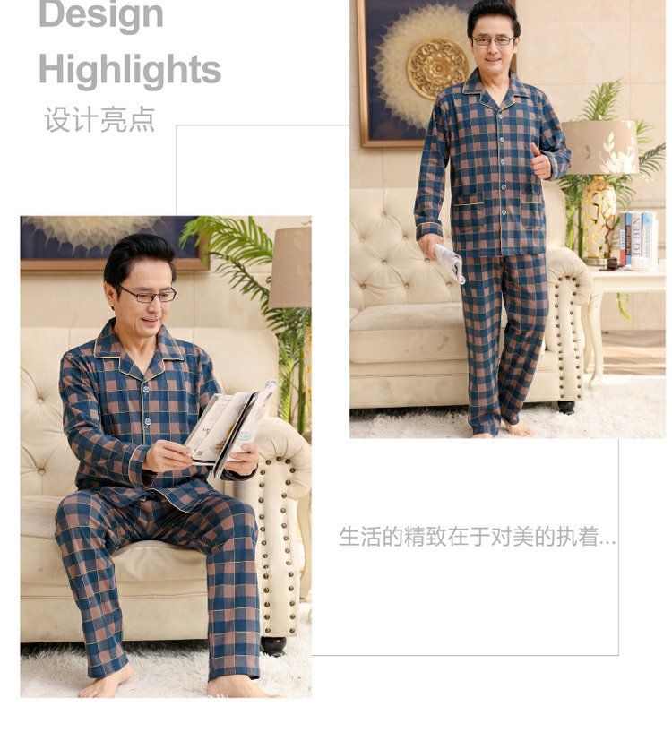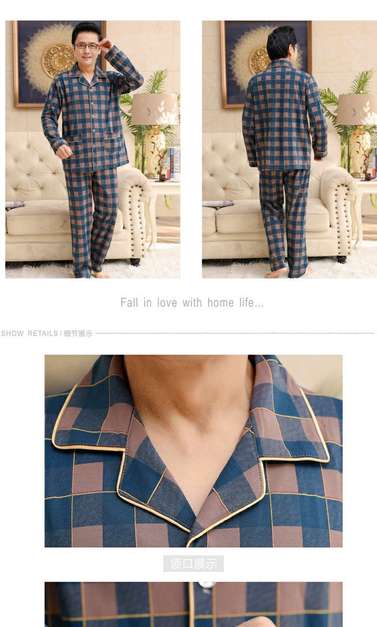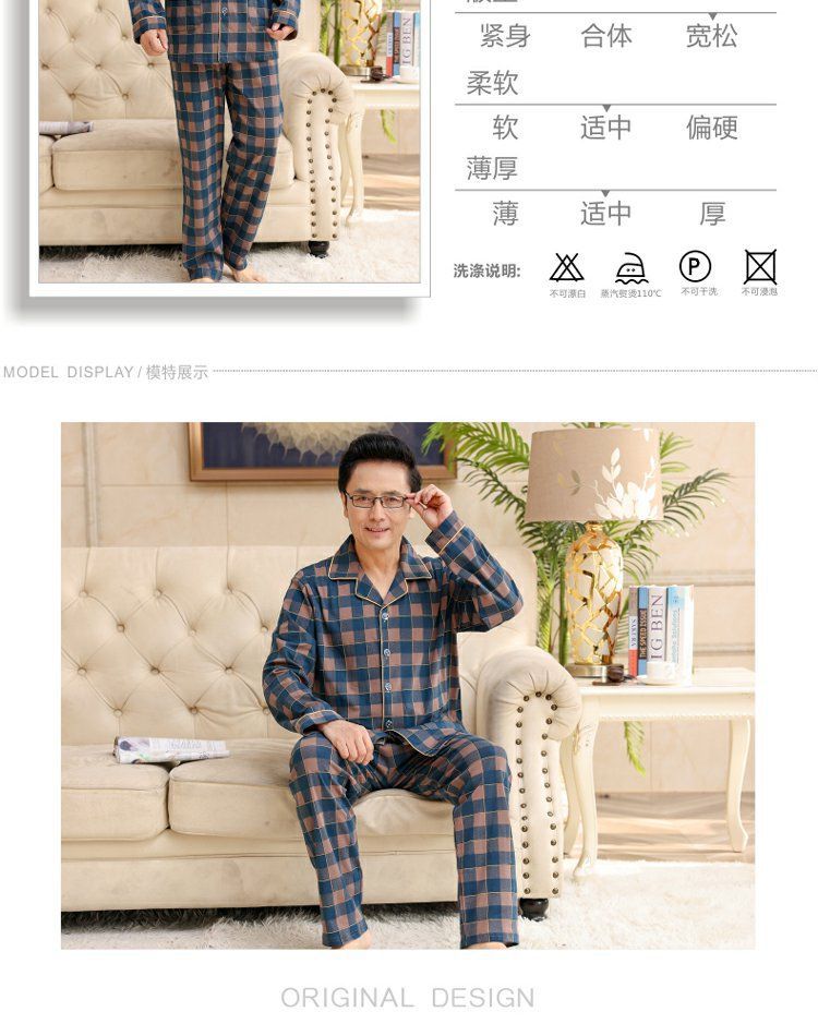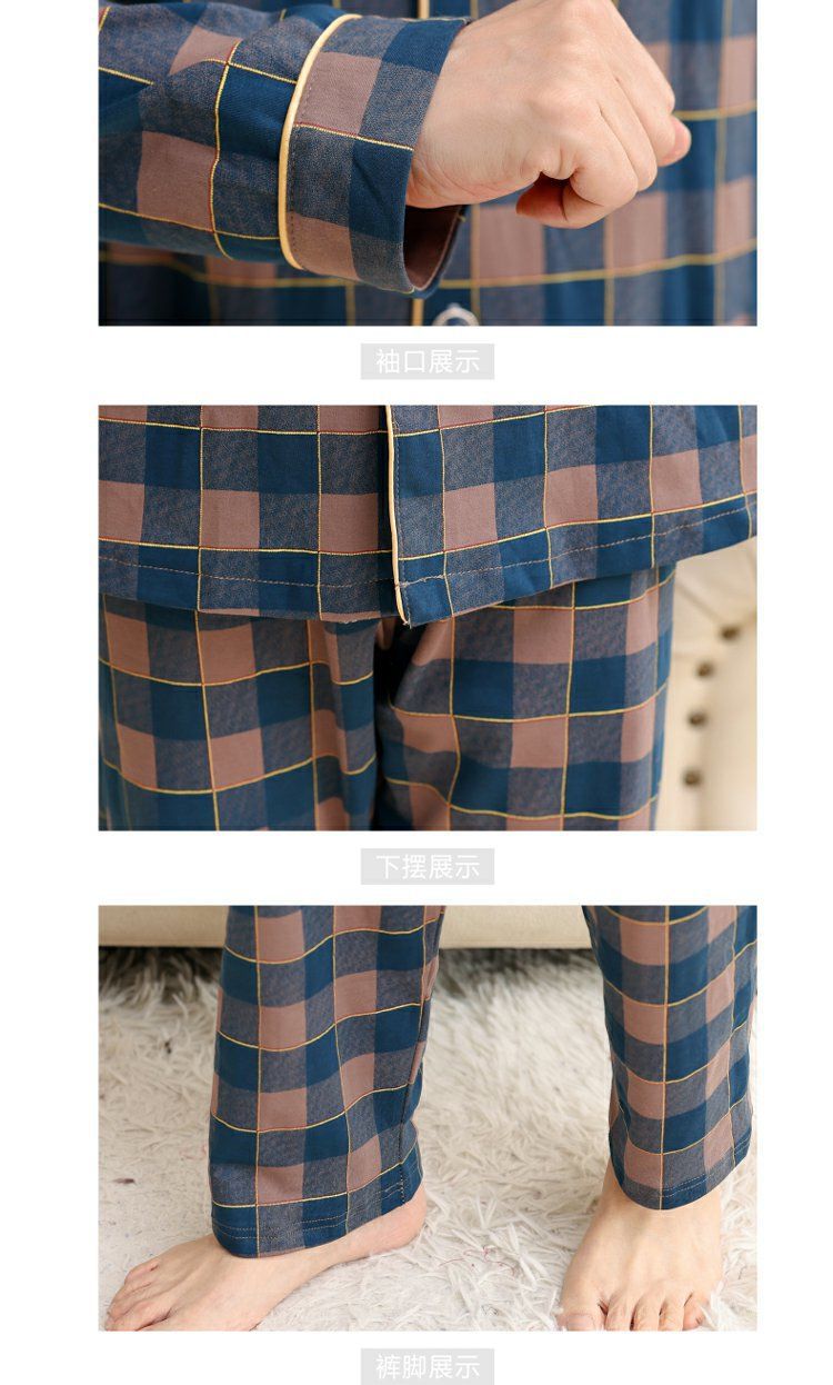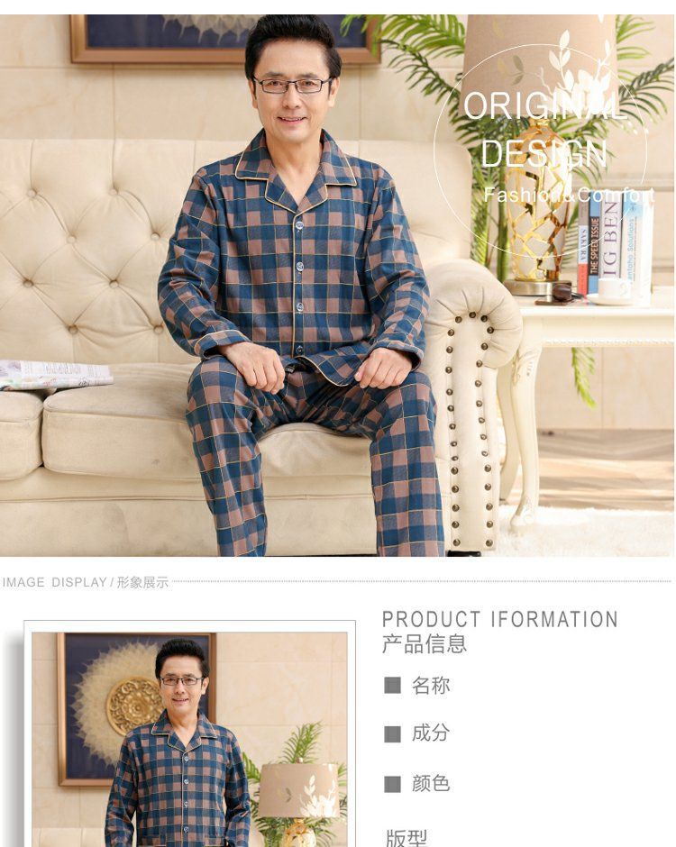 面料主材质:棉 尺码:M【适合80-100斤】 L【适合100-130斤】 XL【适合130-160斤】 2XL【适合160-180斤】 3XL【适合180-200斤】 4XL【适合200-220斤】 面料俗称:纯棉 图案:格子 家居服风格:简约 领型:小翻领 适用性别:男 衣门襟:前扣 件数:2件 颜色分类:MT7302 MT7301 MT7303 MT7304 MT7305 MT7306 MT7308 MT7310 MT7311 MT7312 MT7313 MT7314 MT7315 MT7316 MT9601 MT9602 MT9603 MT9604 MT9605 MT9606 MT9607 MT9608 裤门襟:皮筋 成分含量:95%以上 适用季节:春季 袖长:长袖 厚薄:常规 适用场景:休闲家居 服装款式细节:印花 适用对象:中年 裤长:长裤
