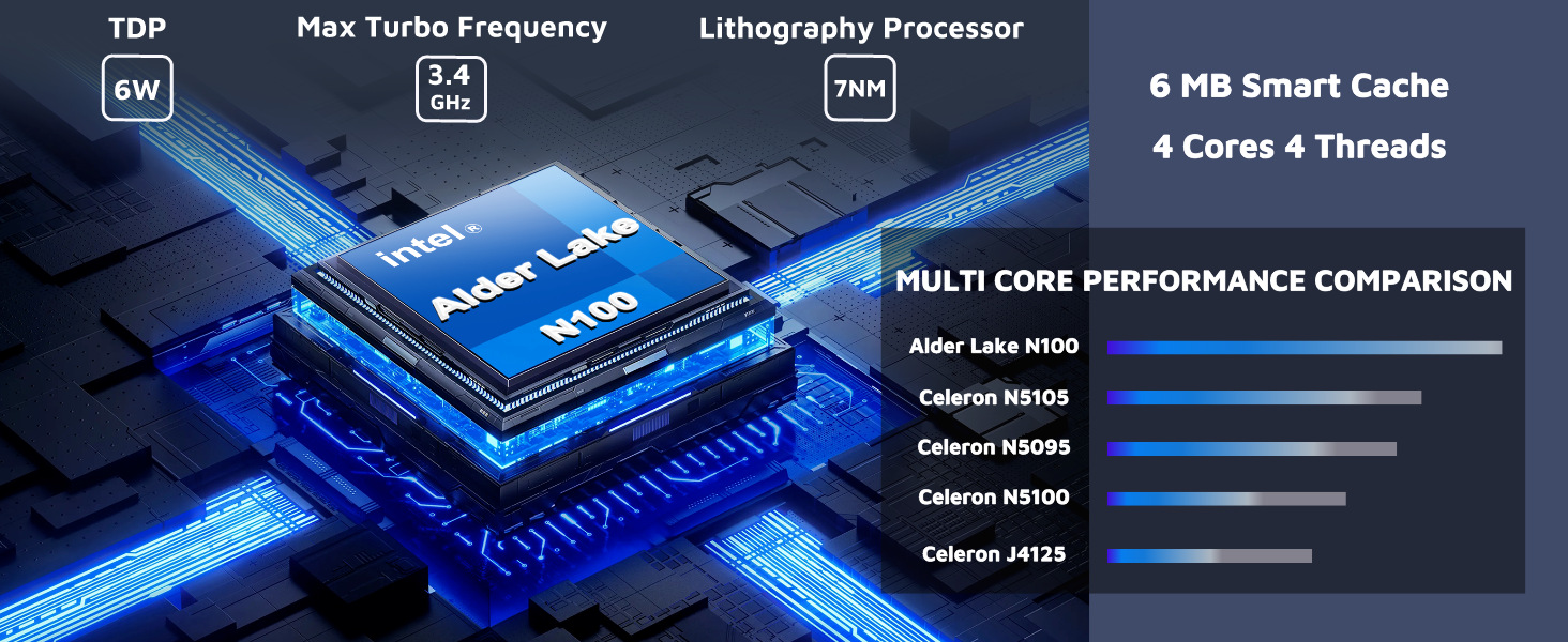 | CPU | Intle®N100 de cuatro núcleos de cuatro hilos |