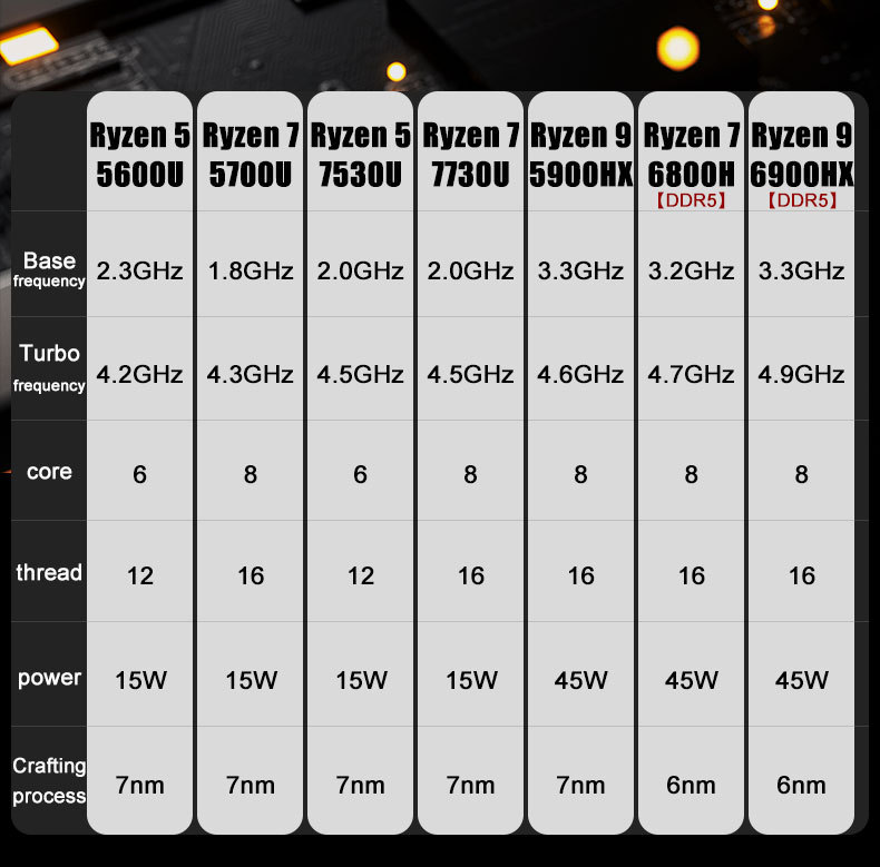 | Tipo de CPU | R9 5900HX/R5 7530u/R7 7730u |