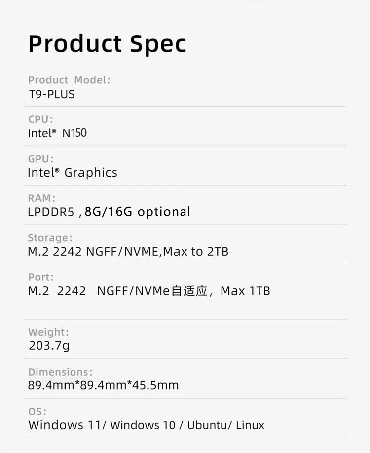 | Colores | N150 DDR5 8G+0,N150 DDR5 8G+128G,N150 DDR5+ 8G+256G,N150 DDR5+ 8G+512G,N150 DDR5+ 8G+1T,N150 DDR5+ 16G+0,N150 DDR5+ 16G+256G,N150 DDR5+ 16G+512G,N150 DDR5+ 16G+1T,N150 DDR5+ 16G+2T |