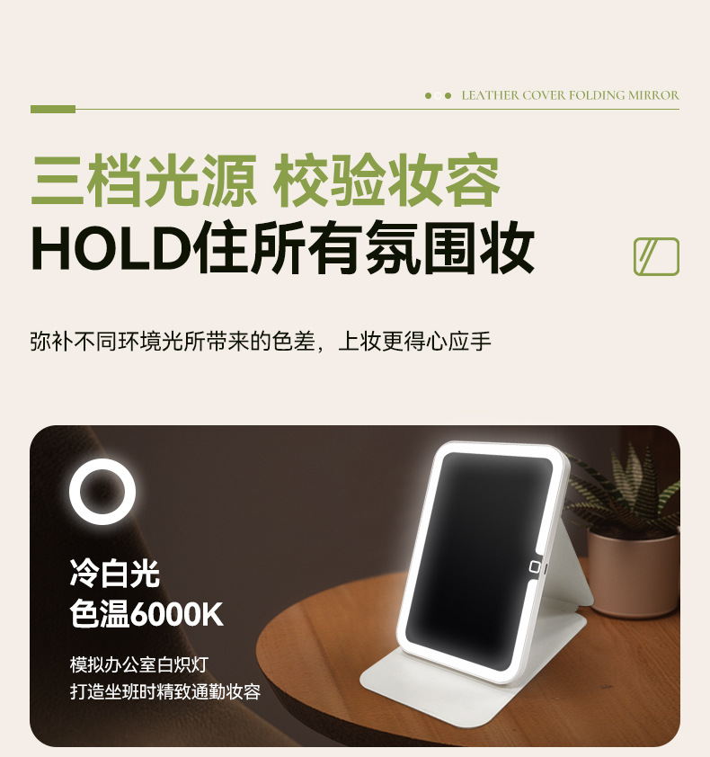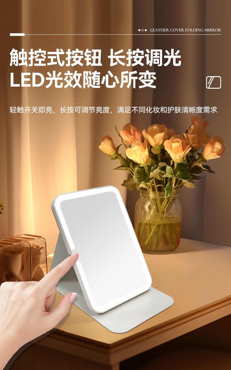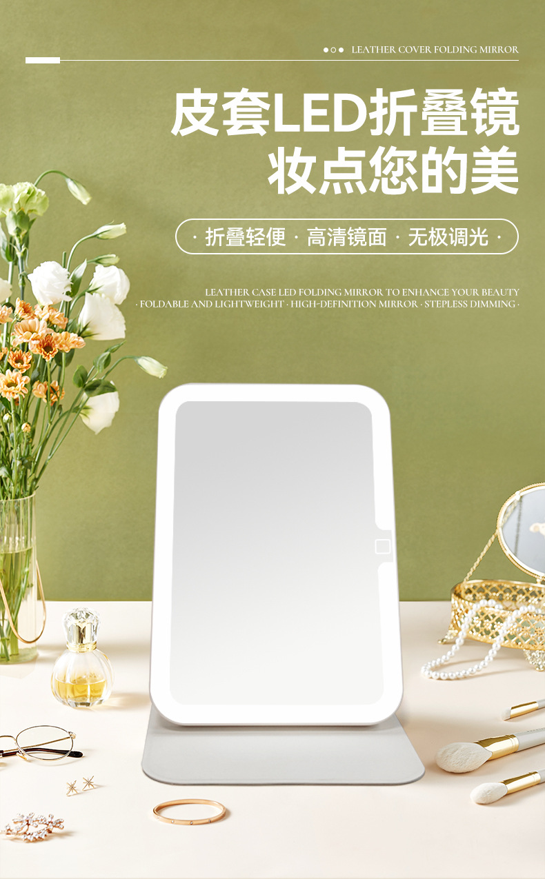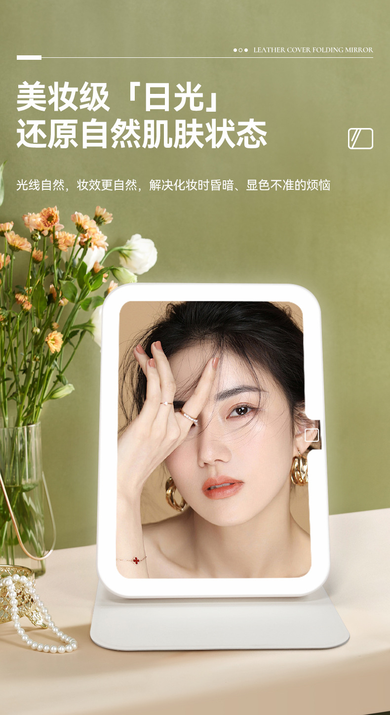 Espejo de maquillaje led de escritorio con luz, plegable portátil, dormitorio de escritorio vertical, espejo plano de PU de viaje rojo neto