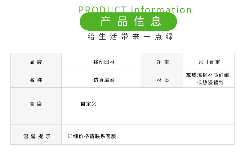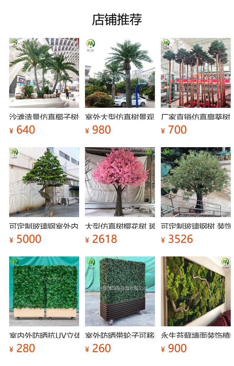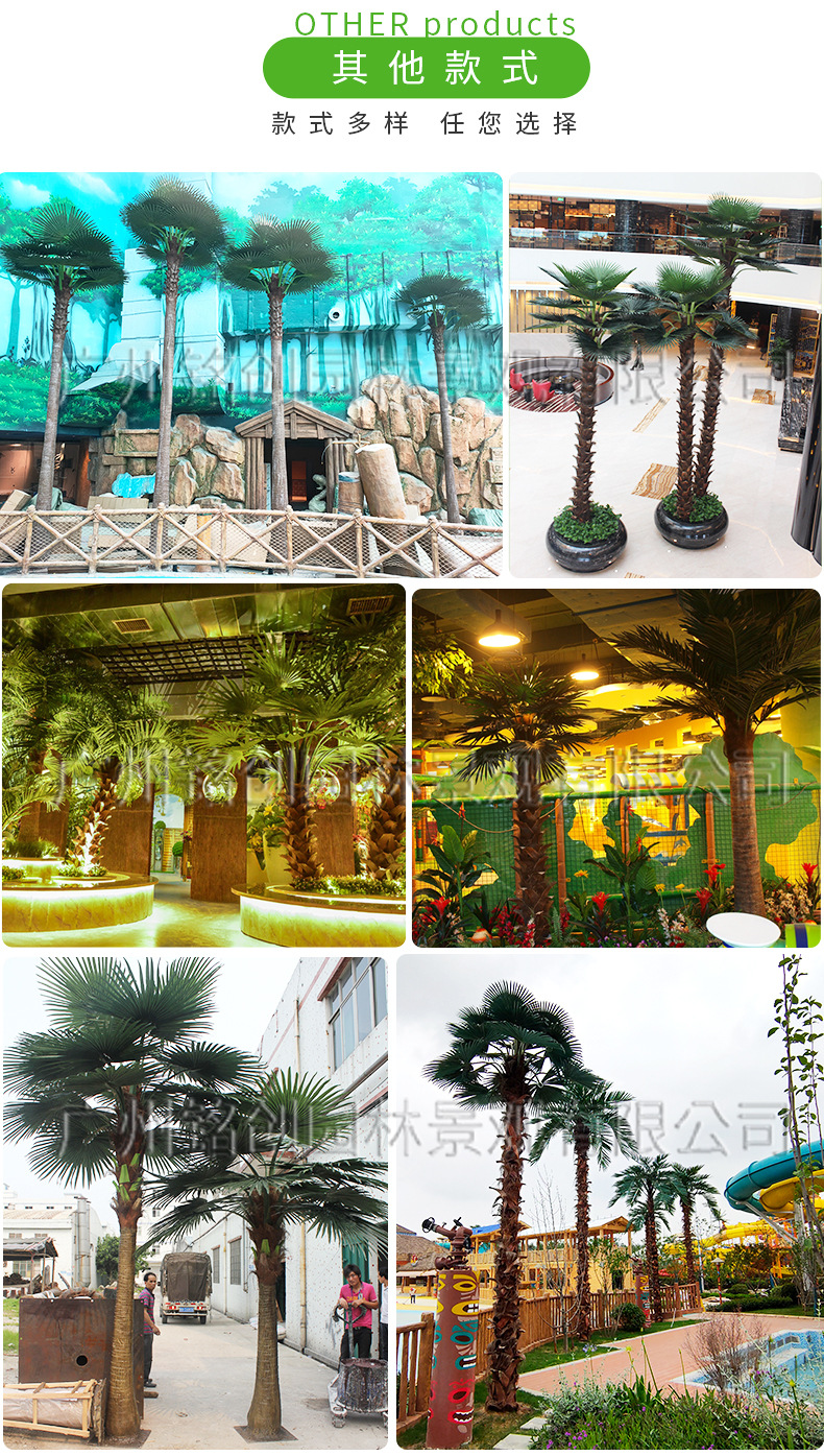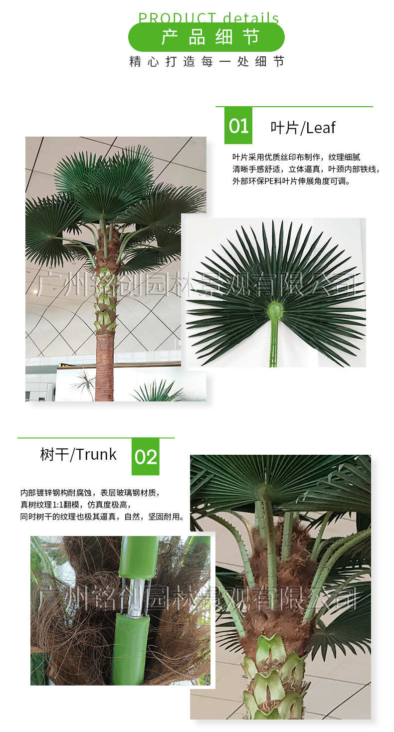 此款扇葵表层采用玻璃钢材质制作,树干内部镀锌结构,耐腐蚀,叶片采用优质丝印布制作,纹理逼真细腻,树干的纹理也极其逼真,自然,也可接受其他造型树的定制,来图加工,来样加工,如需了解更多产品,可点击此处联系客服