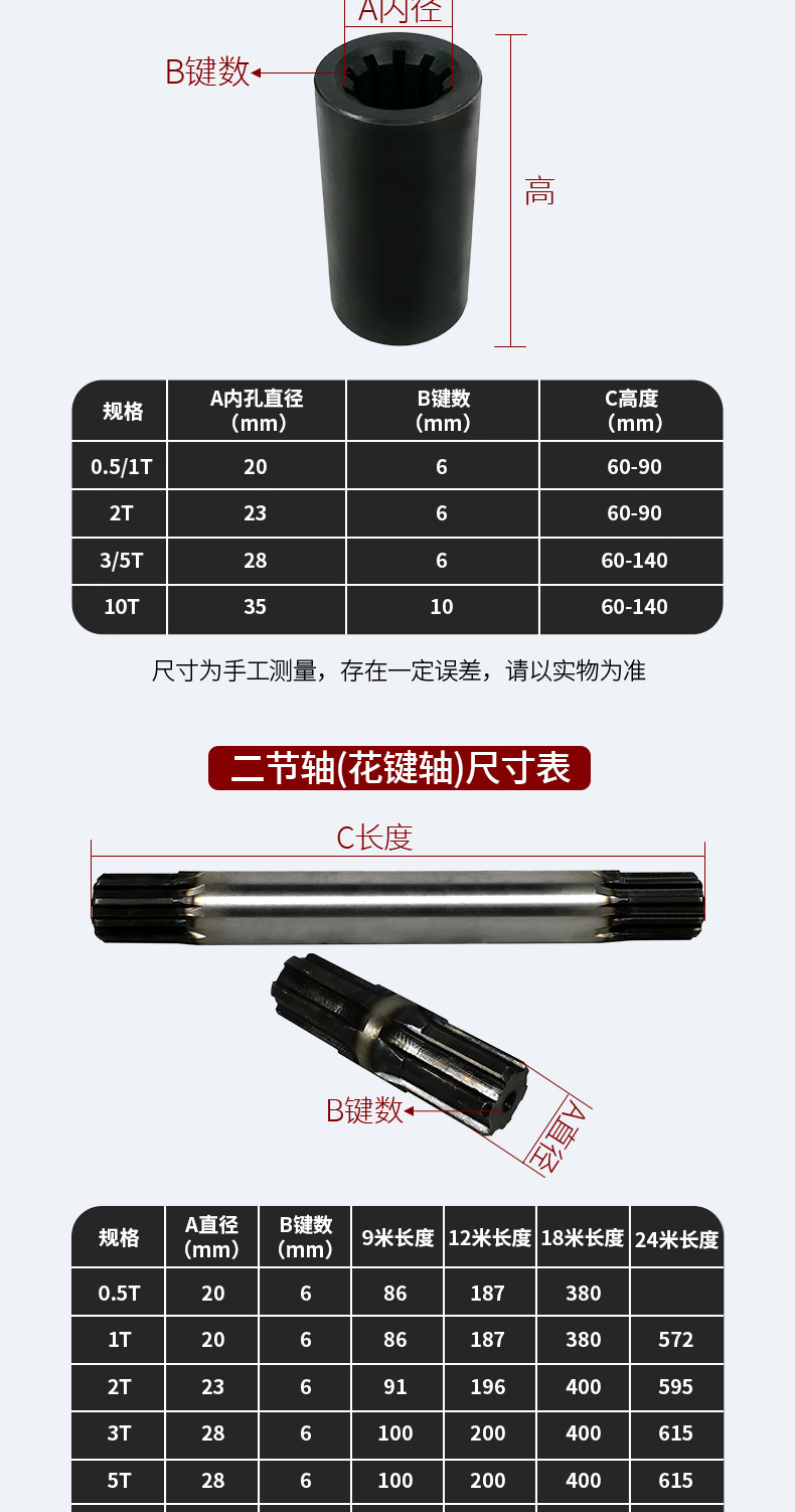 | Especificaciones | Acoplamiento 0.5T [modelo ordinario],Acoplamiento 1T [modelo ordinario],Acoplamiento 2T [modelo ordinario],Acoplamiento 3T [modelo ordinario],Acoplamiento 5T [modelo ordinario],Acoplamiento 10T [modelo ordinario],Acoplamiento 16T [modelo ordinario],Acoplamiento 20T [modelo ordinario],Acoplamiento 32T [modelo ordinario],Acoplamiento 0.5T [forja gruesa estándar nacional],Acoplamiento 1T [forja gruesa estándar nacional],Acoplamiento 2T [forja gruesa estándar nacional],Acoplamiento 3T [forja gruesa estándar nacional],Acoplamiento 5T [forja gruesa estándar nacional],Acoplamiento 10T [forja gruesa estándar nacional],Acoplamiento 16T [forja gruesa estándar nacional],Acoplamiento 20T [forja gruesa estándar nacional],Acoplamiento 32T [forja gruesa estándar nacional],Acoplamiento 0.5/1T [modelos Jiangyin],Acoplamiento 2T [modelos Jiangyin],Acoplamiento 3T [modelos Jiangyin],Acoplamiento 5T [modelos Jiangyin],Acoplamiento 10T [modelos Jiangyin],Acoplamiento 16T [modelos Jiangyin],Acoplamiento 20T [modelos Jiangyin],Acoplamiento 32T [modelos Jiangyin],1T-9 m dos ejes,1T-12 m eje de dos secciones,1T-18 m eje de dos secciones,1T-24 m eje de dos secciones,1T-30 m dos ejes,2T-9 m eje de dos secciones,2T-12 m eje de dos secciones,2T-18 m eje de dos secciones,2T-24 m eje de dos secciones,2T-30 m eje de dos secciones,3T5T-9 m eje de dos secciones,3T5T-12 m eje de dos secciones,3T5T-18 m eje de dos secciones,3T/5T-24 m eje de dos secciones,3T/5T-30 m dos ejes,10T16T-9 m eje de dos secciones,10T16T-12 m eje de dos secciones,10T16T-18 m eje de dos secciones,10T/16T-24 m eje de dos secciones,10T/16T-30 m eje de dos secciones,Conjunto de dos secciones [0.5/1T],Conjunto de dos secciones [2T],Conjunto de dos secciones [3/5T],Conjunto de dos secciones [10/16T],Conjunto de dos secciones [20T] |
