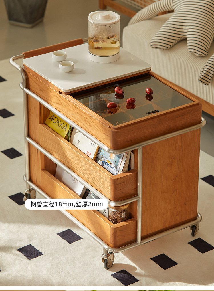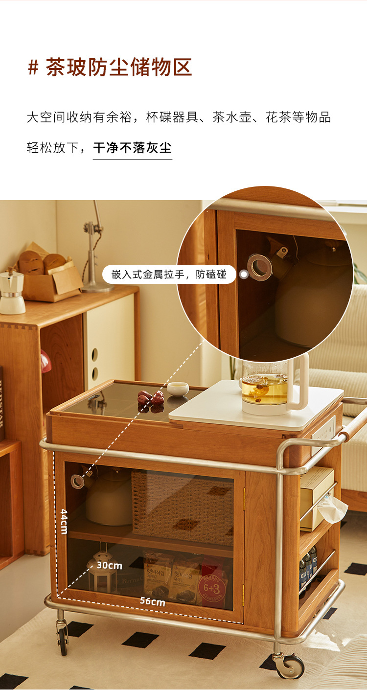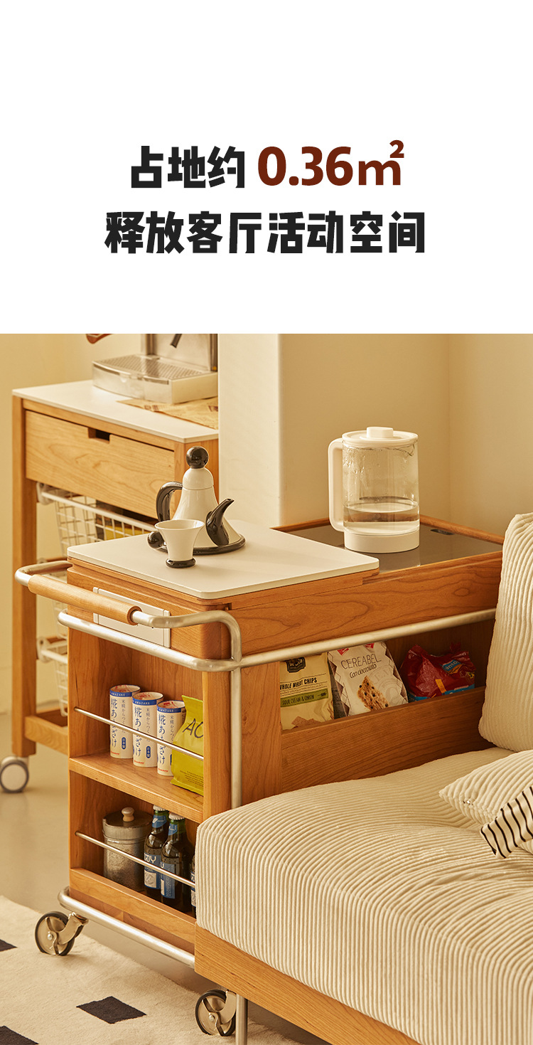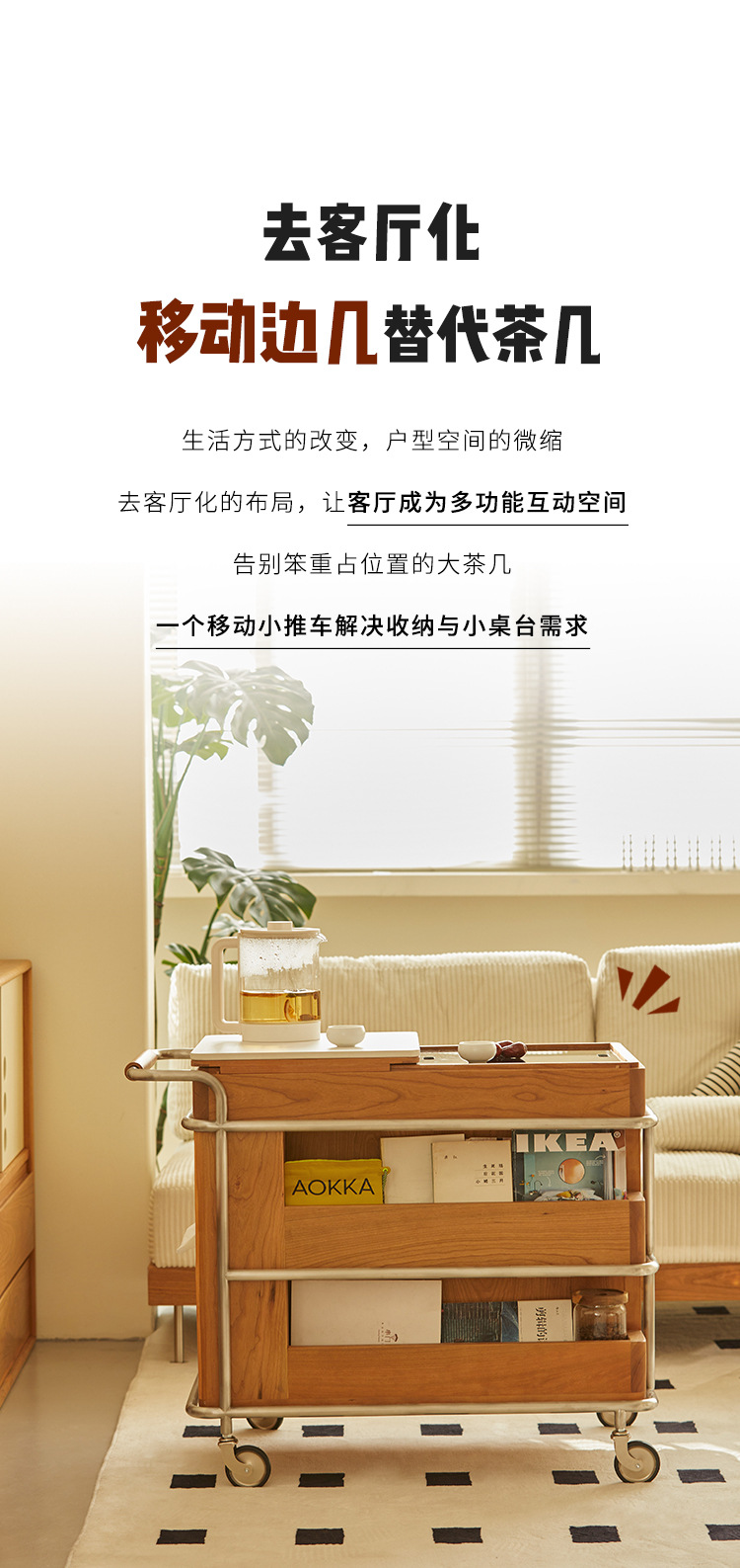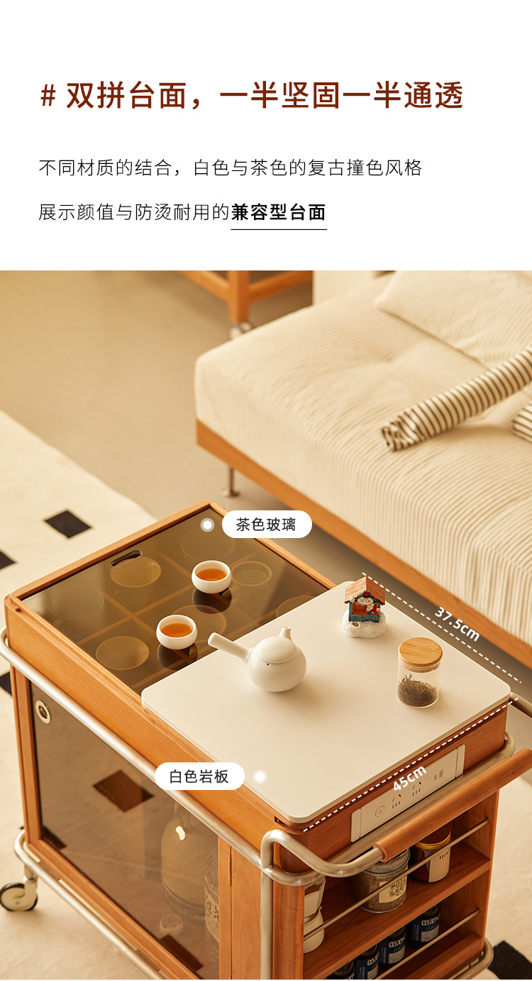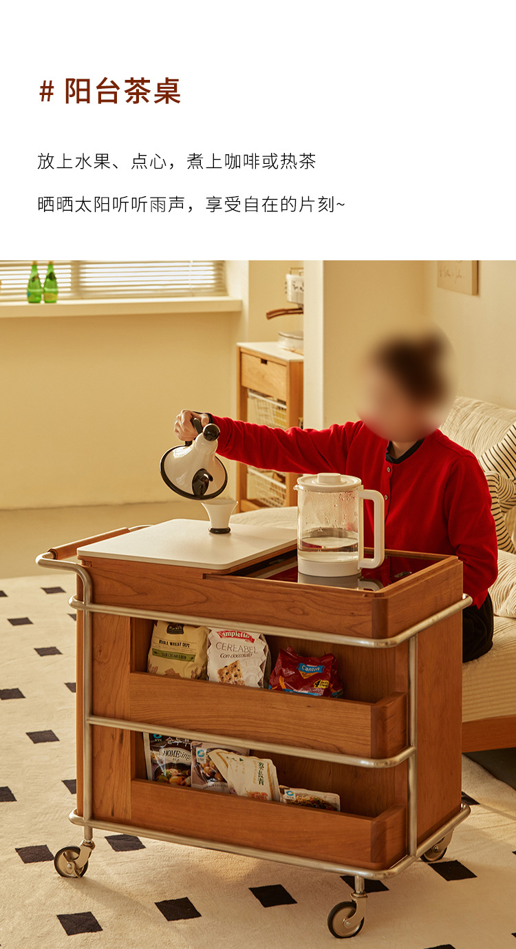 Mueble de té móvil de estilo antiguo, mesa de té, sofá, gabinete lateral, carrito, color de madera de cerezo, balcón de apartamento pequeño, mesa de té pequeña