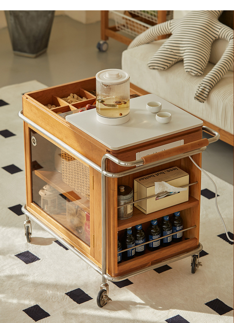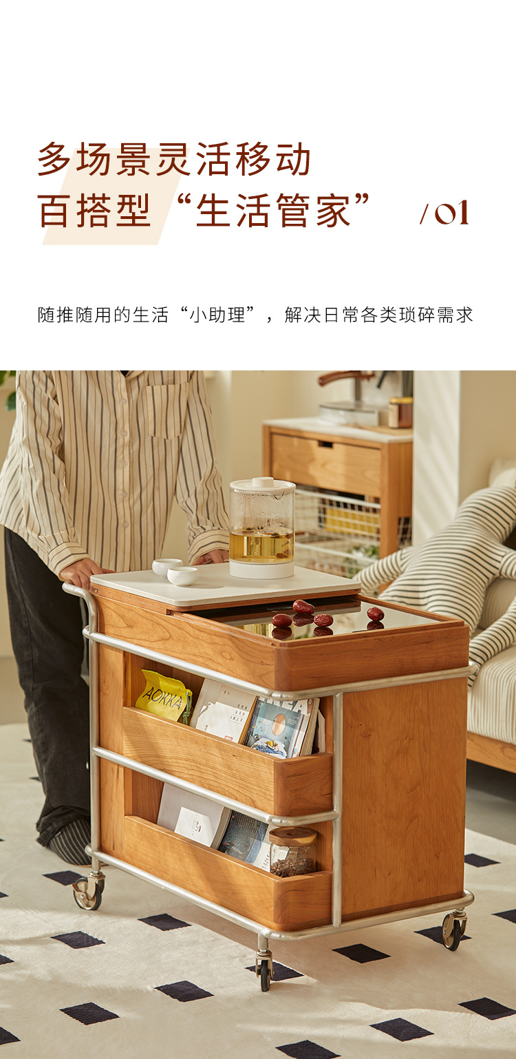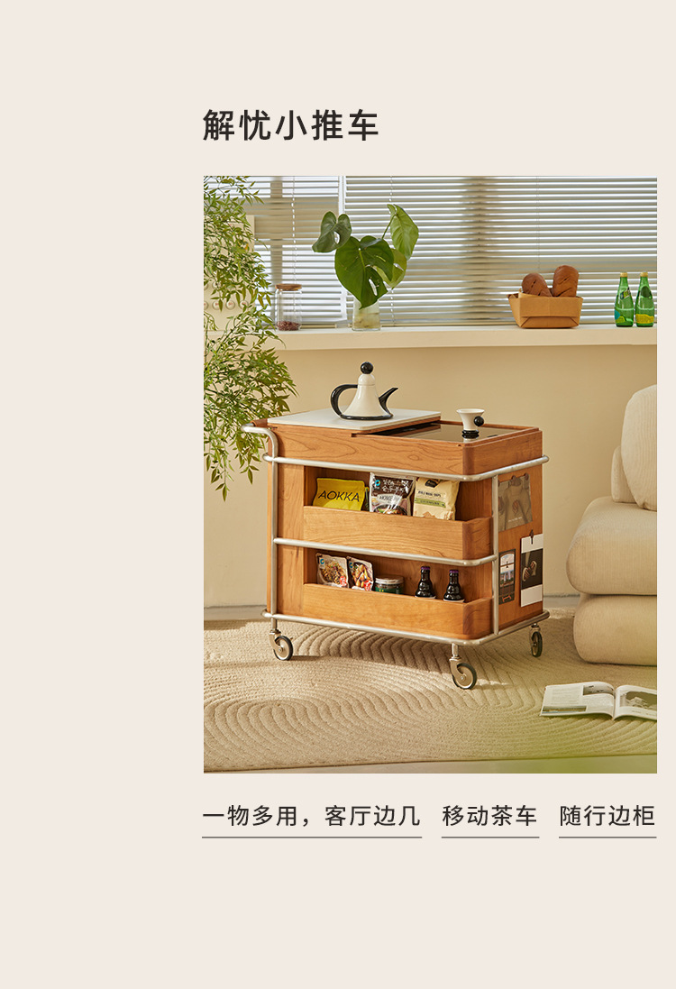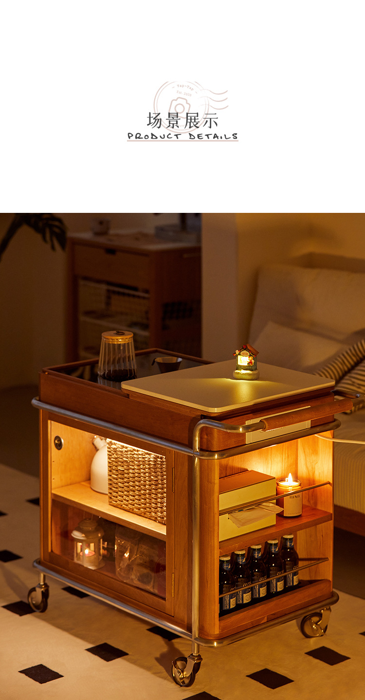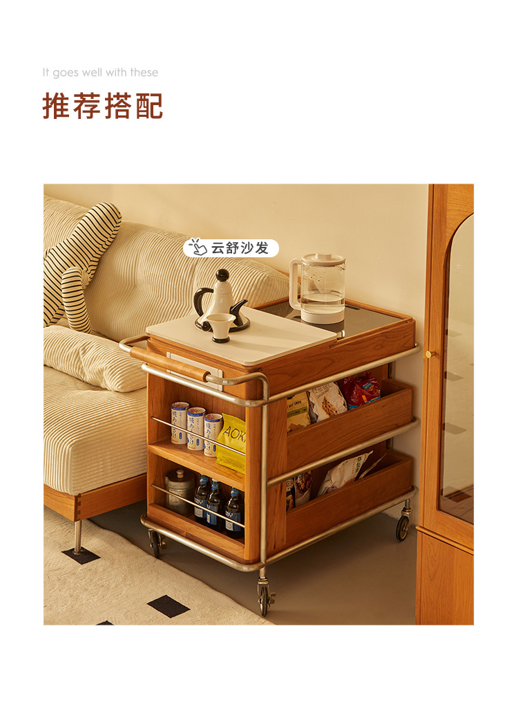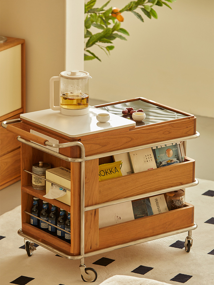 Mueble de té móvil de estilo antiguo, mesa de té, sofá, gabinete lateral, carrito, color de madera de cerezo, balcón de apartamento pequeño, mesa de té pequeña