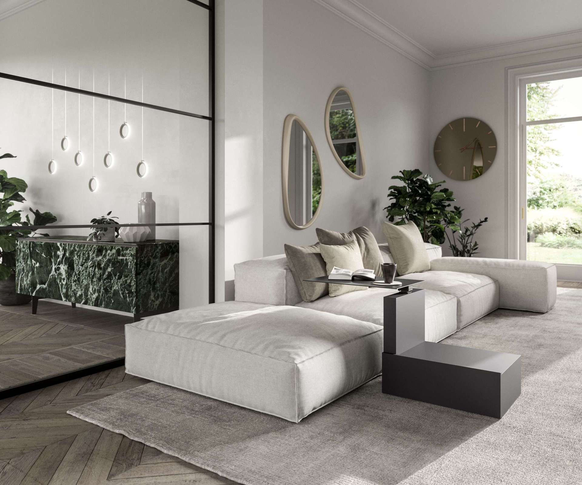 Sofá nórdico con varias mesas redondas de la sala de estar, pequeño dormitorio de lujo, mesas de cabezal de cama, balcón