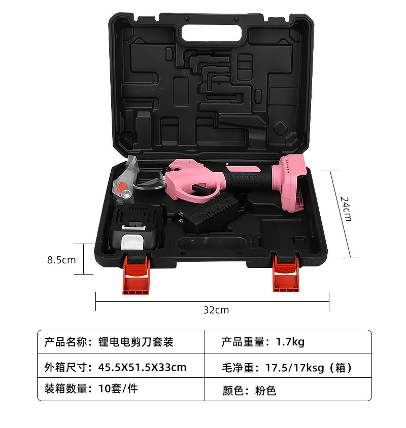 Corte de rama rosa, una batería y una caja de plástico,Cizalla de rama azul, una batería, una caja de plástico,Corte de rama azul dos baterías y una caja de plástico