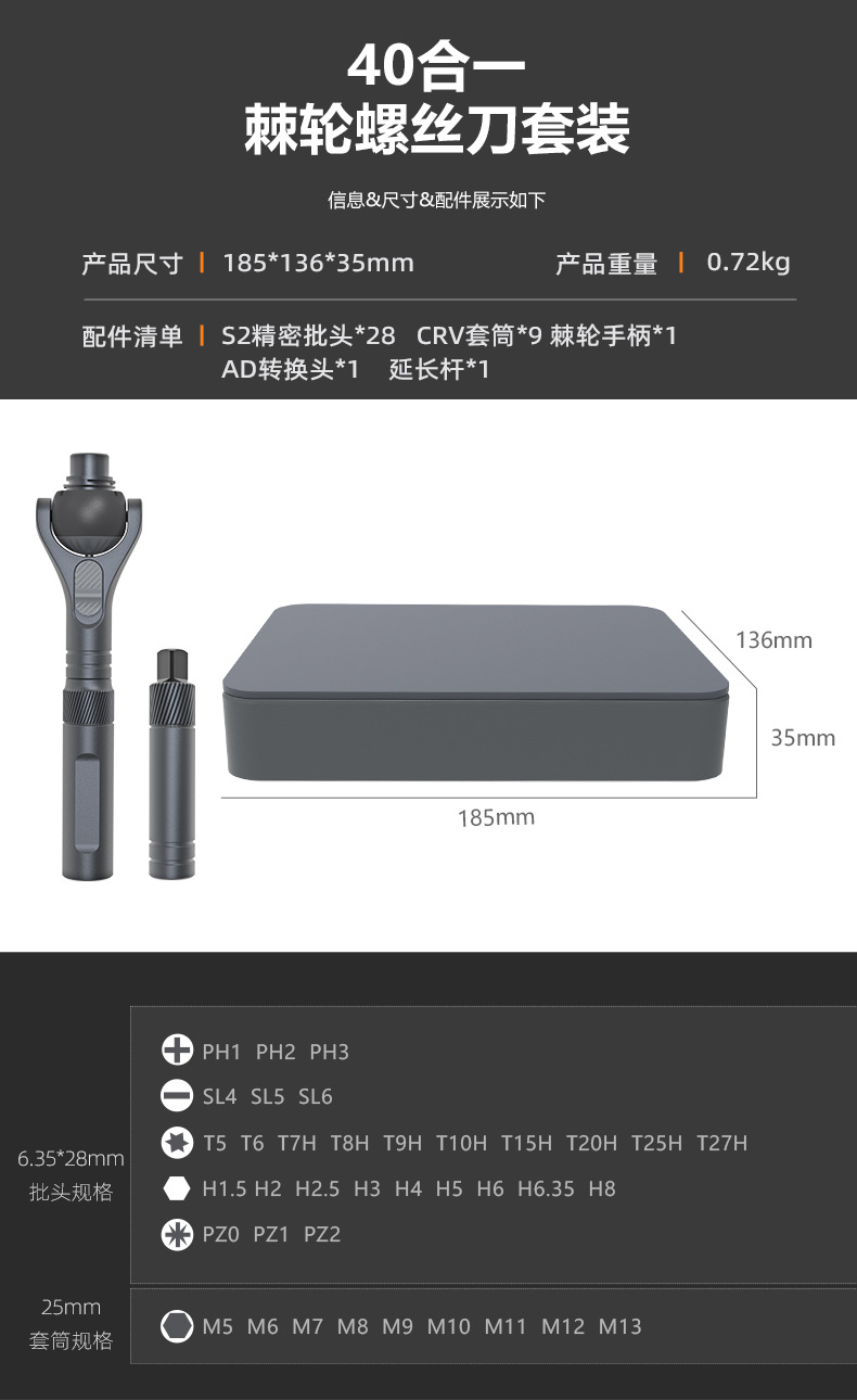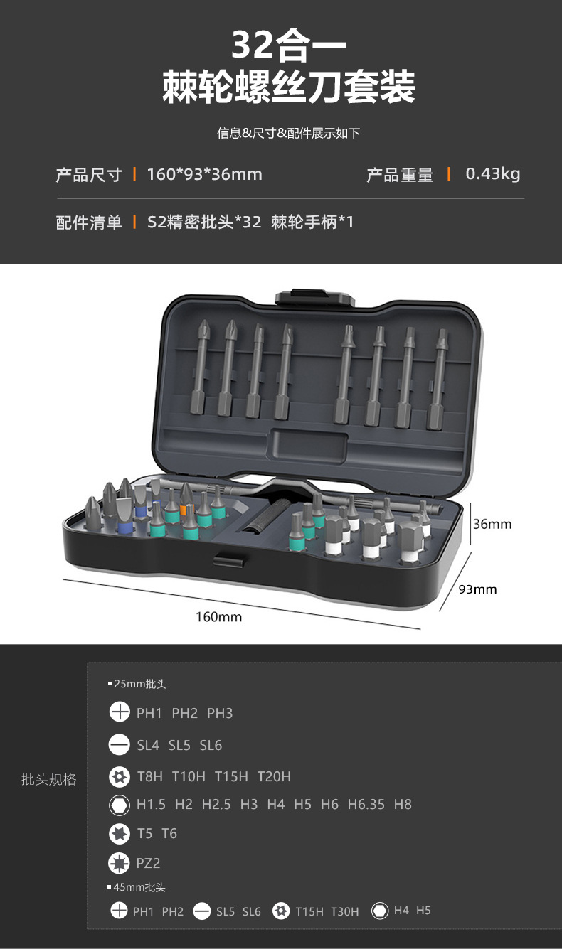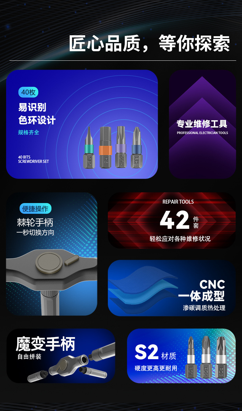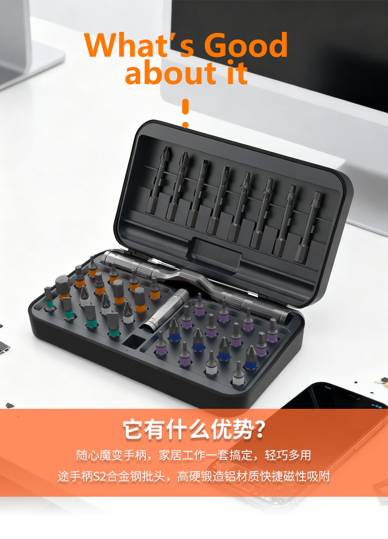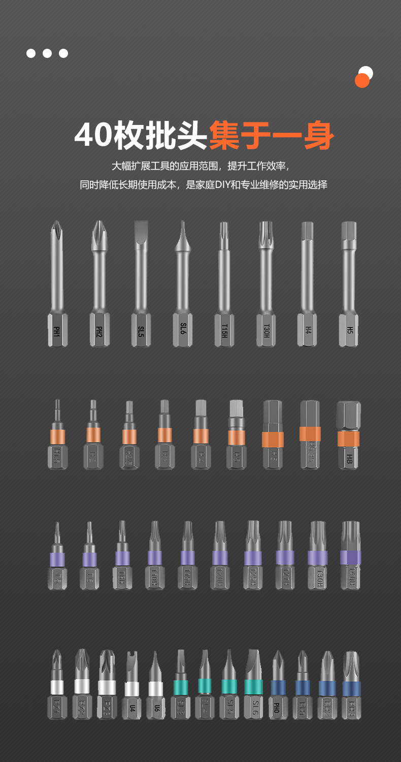 | Especificaciones y modelos | Juego de destornilladores 24 en 1 (carcasa de aluminio gruesa),Juego de destornilladores de carraca 24 en 1,Juego de destornilladores de carraca 32 en 1,Juego de destornilladores de trinquete 42 en 1 (gris),Juego de destornilladores de trinquete 42 en 1 (naranja),Juego de destornilladores de trinquete 66 en 1 (versión personalizada),Juego de destornilladores de trinquete de 40 piezas,Juego de destornilladores de trinquete RS2,Destornillador de carraca 24 en 1 (versión personalizada) |