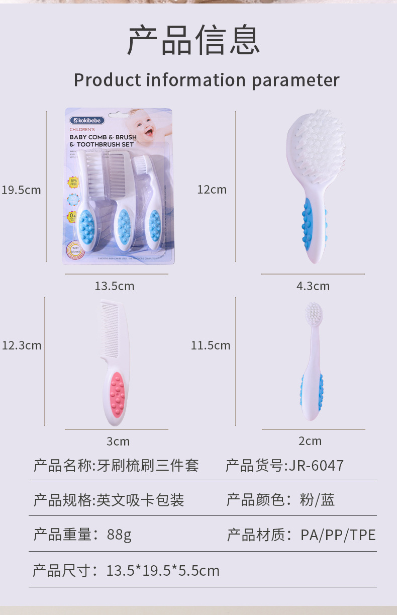 【尺寸】含包装尺寸13.5*19.5*5cm 梳子3*12.3*1.5cm 刷子4.3*12*3cm 牙刷2.5*12*2.5cm