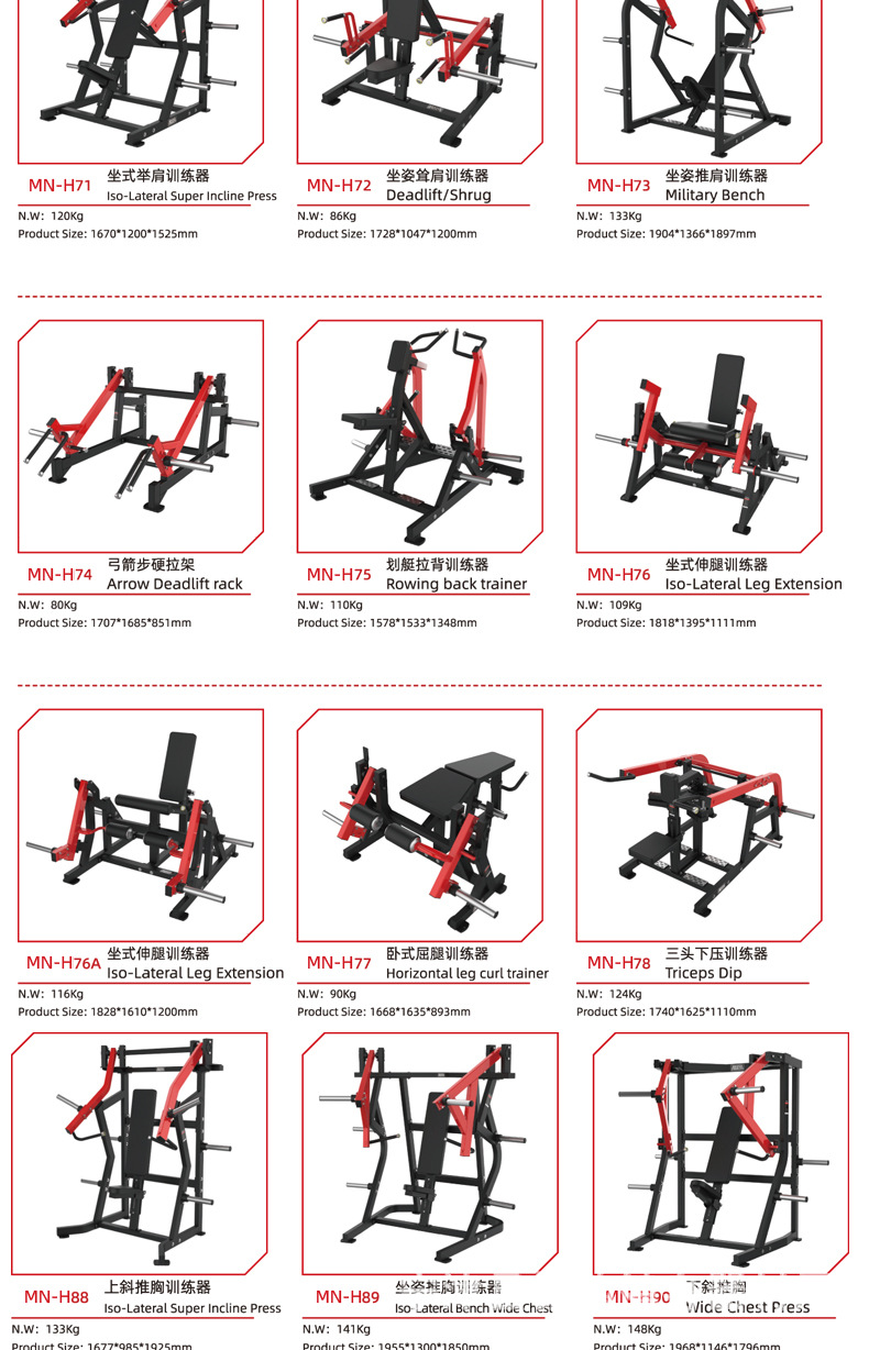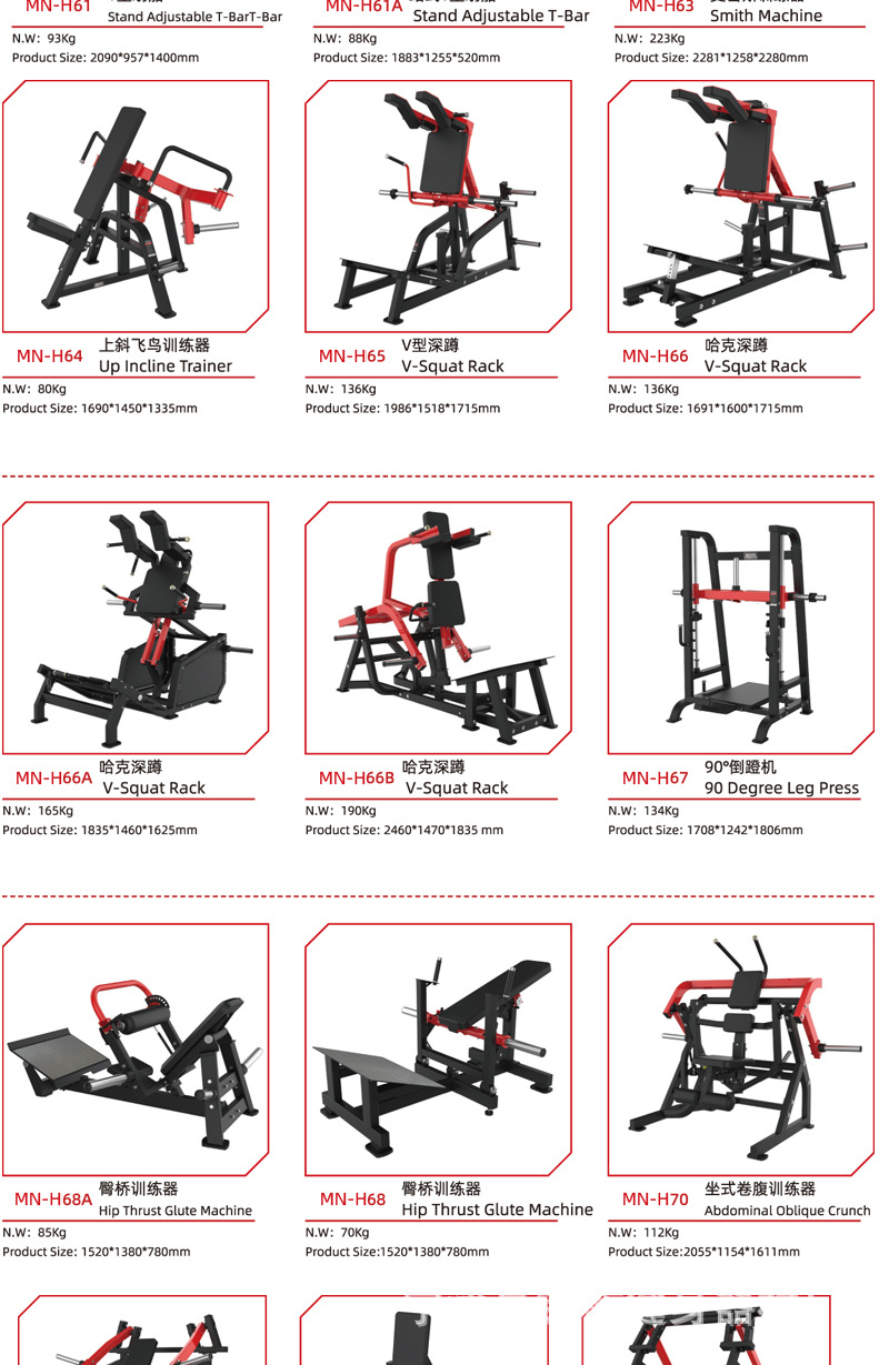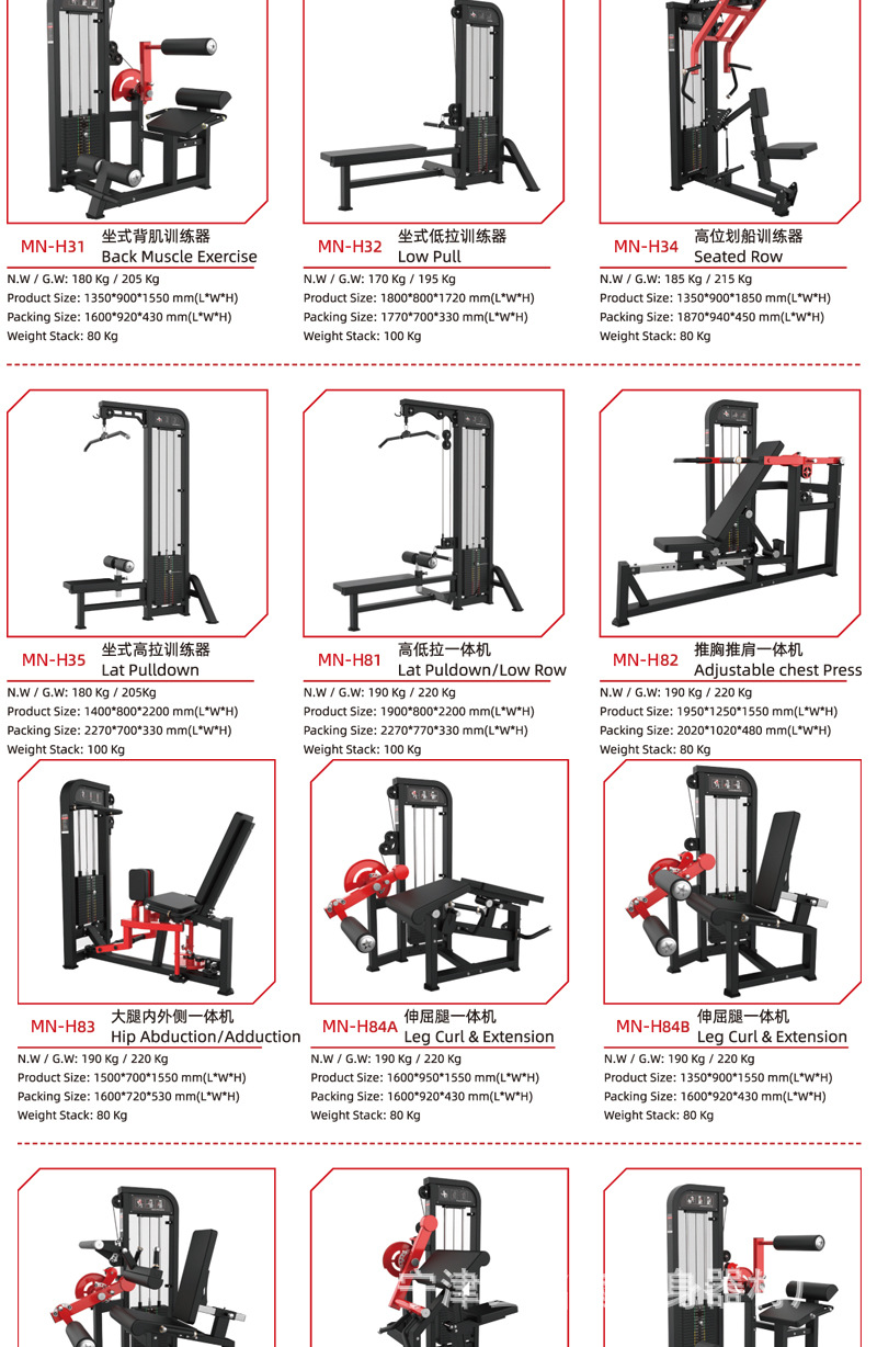 | Especificaciones | Dentro y fuera del muslo,Piernas extendidas,Tijeras tirando de la espalda,Pecho de empuje de torre,Abrazadera lateral,Levantamiento de hombros sentado,Pecho de mariposa,Remo tirando de la espalda,Alto y bajo tirando de la espalda,Remo tipo T,Horizonte plano,Taburete con mancuernas ajustable,Soporte de campana,Personalización de otros equipos |