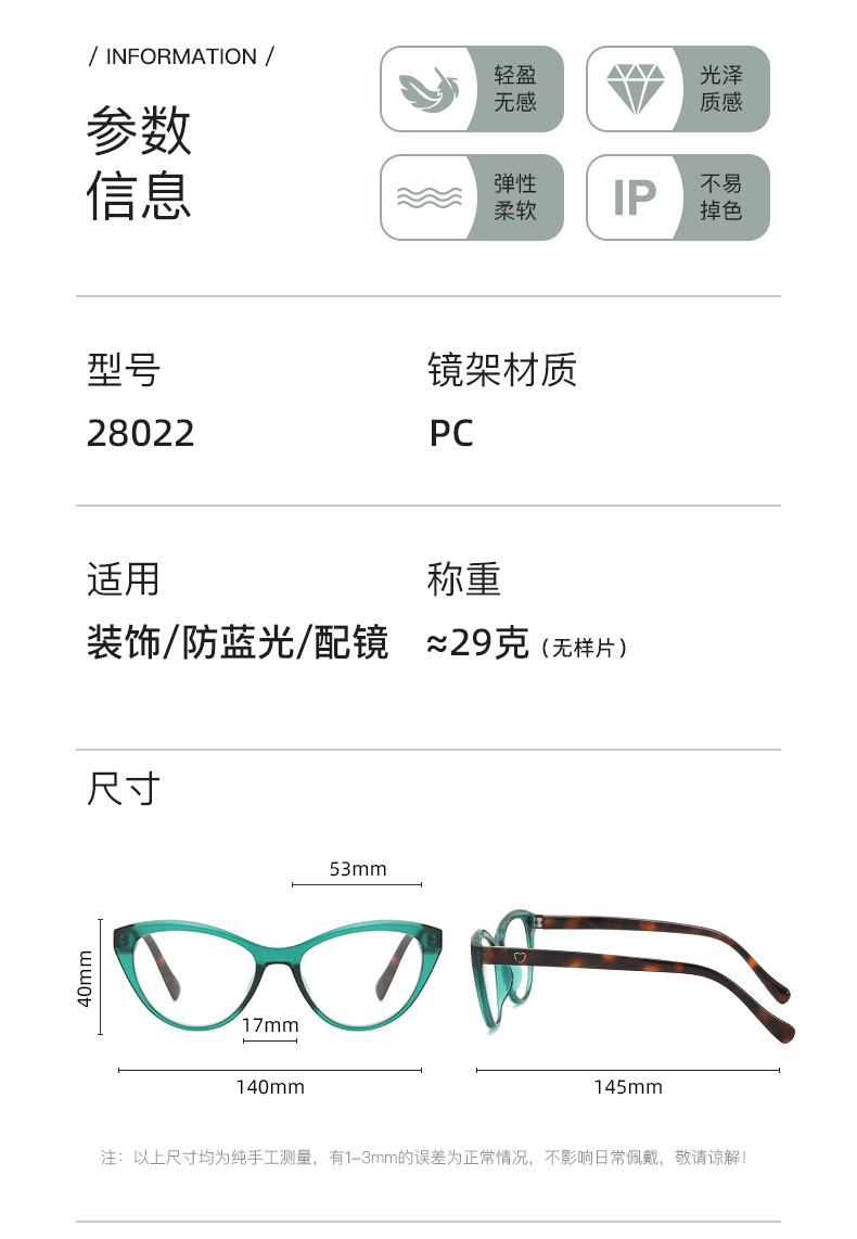 | Color del marco | C1. Negro brillante,C2. Carey amarillo,C3. Té transparente,C4. Pie de carey con marco verde,C5. A través del vino tinto,C6. Blanco |