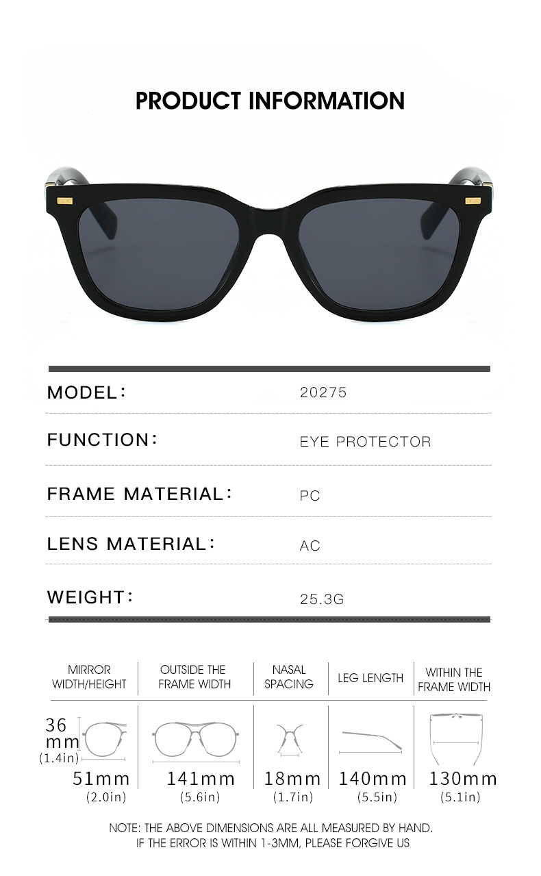 | Colores | Montura negra,Película amarilla de marco negro,Frame azul Champagne,Tabletas de té con marco de carey,Frame de té verde oscuro,Frame en polvo,Frame negro y blanco,Frame blanco,Frame de té blanco |