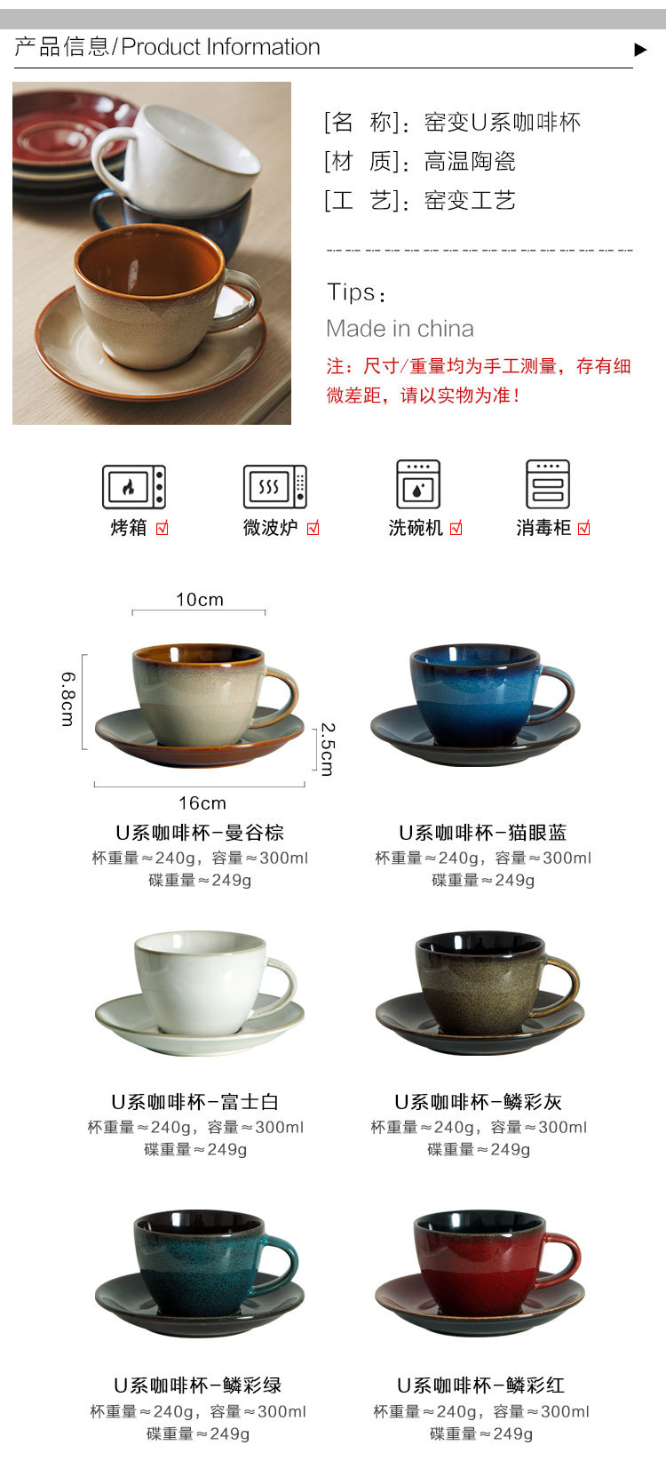 | Color | Bangkok Brown-Taza y platillo de café en forma de U,Escala de color rojo-taza de café en forma de U y platillo,Escala de color gris en forma de U taza de café y platillo,Ojo de Gato Azul-Taza de café en forma de U y platillo,Escala de color verde en forma de U taza de café y platillo |