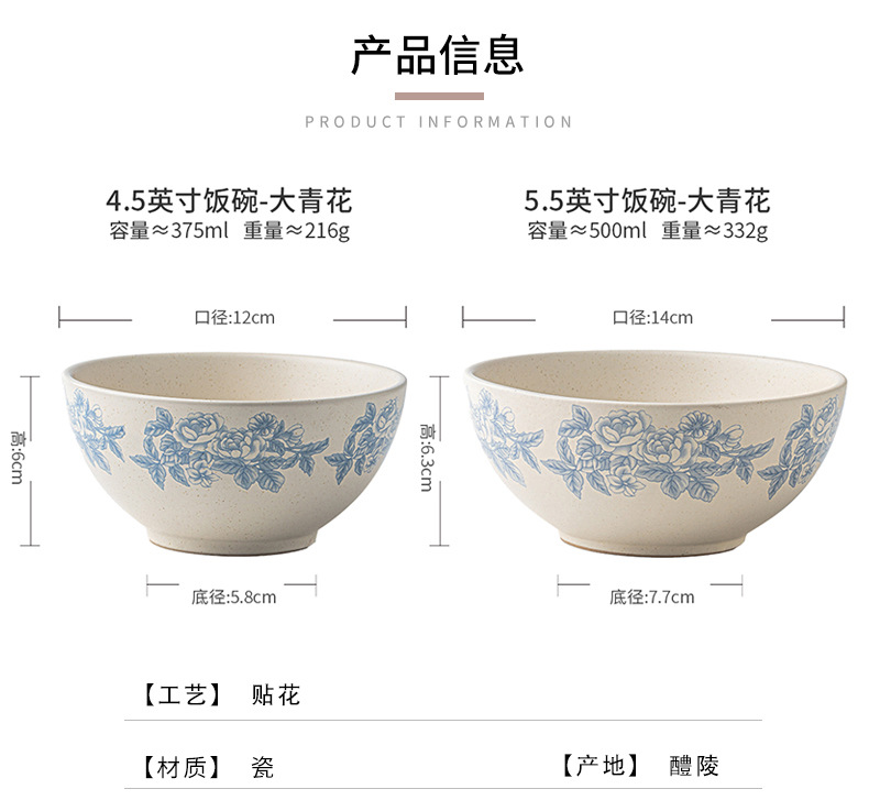 | Color | Tazón de arroz de 5,5 pulgadas - Gran Azul y blanco, tazón de arroz de 4,5 pulgadas - Gran Azul y blanco |