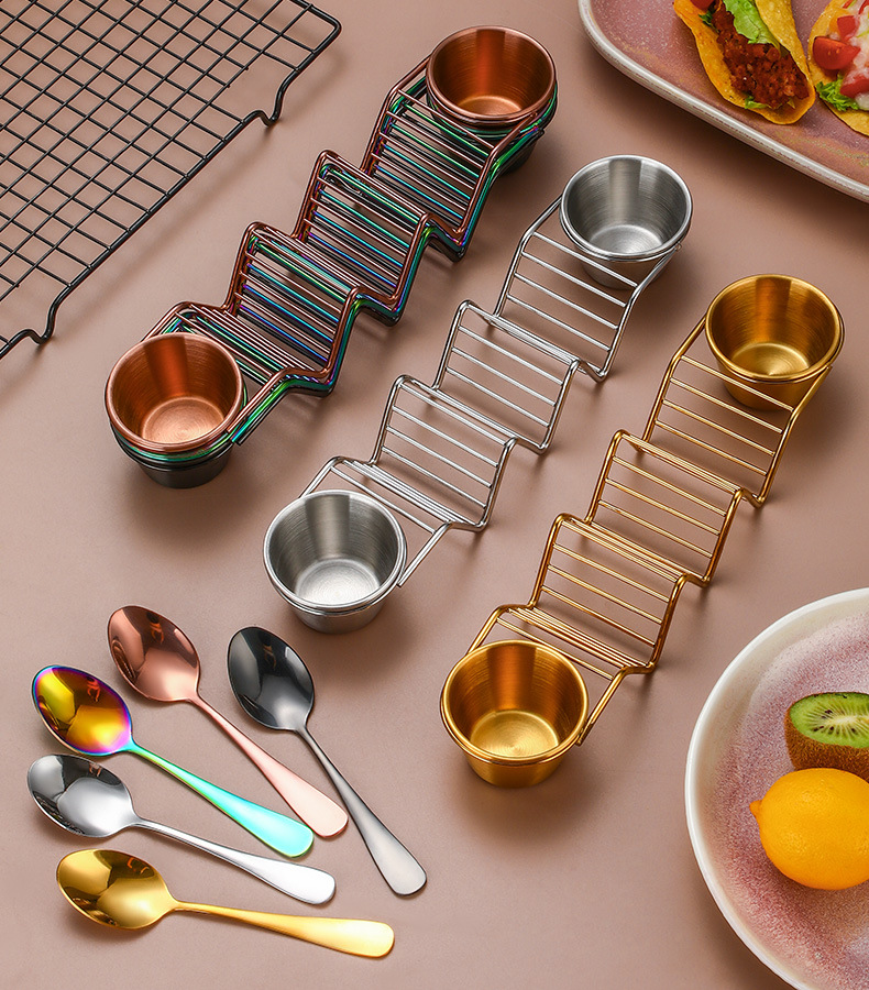 | Especificaciones | [Traje de color original] 1 estante + 2 platos de salsa + 1 cuchara de postre,[Traje dorado] 1 estante + 2 platos de salsa + 1 cuchara de postre,[Traje de oro rosa] 1 estante + 2 platos de salsa + 1 cuchara de postre,[Traje de color mágico] 1 estante + 2 platos de salsa + 1 cuchara de postre,[Traje Negro] 1 estante + 2 platos de salsa + 1 cuchara de postre,[Color natural] doble titular de la taza,[Oro] titular de la taza Doble,[Oro Rosa] titular de la taza Doble,[Color mágico] portavasos Doble,[Negro] titular de la taza Doble,[Color natural] 70ml taza de salsa,[Oro] taza de salsa de 70ml,[Oro Rosa] 70ml taza de salsa,[Color mágico] taza de salsa 70ml,[Negro] 70ml taza de salsa |