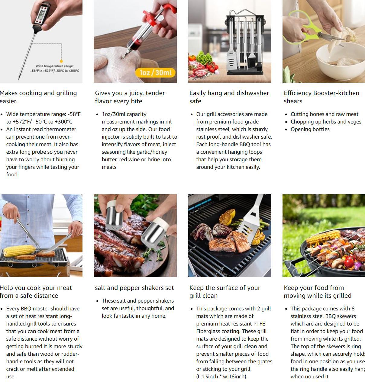 | Especificaciones | Juego de 33 piezas de utensilios de barbacoa de 16 pulgadas |